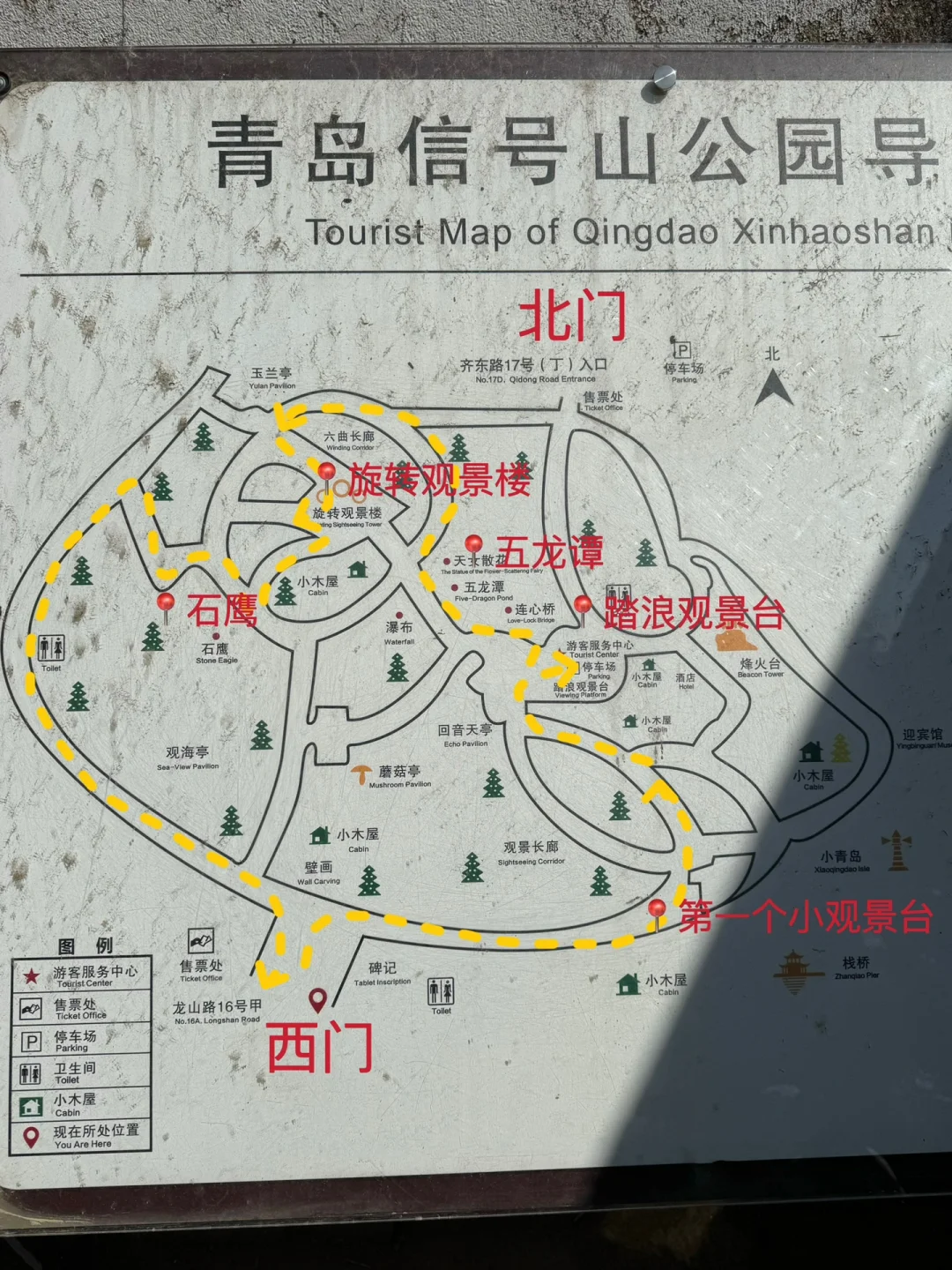 1️⃣西门进,右手边上山,抵达第一个小观景台,拍栈桥