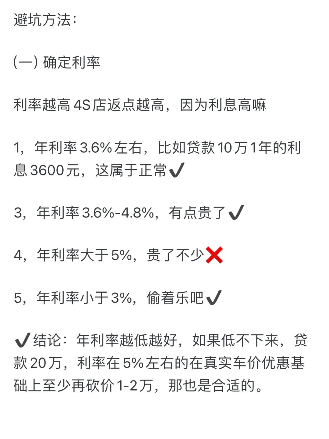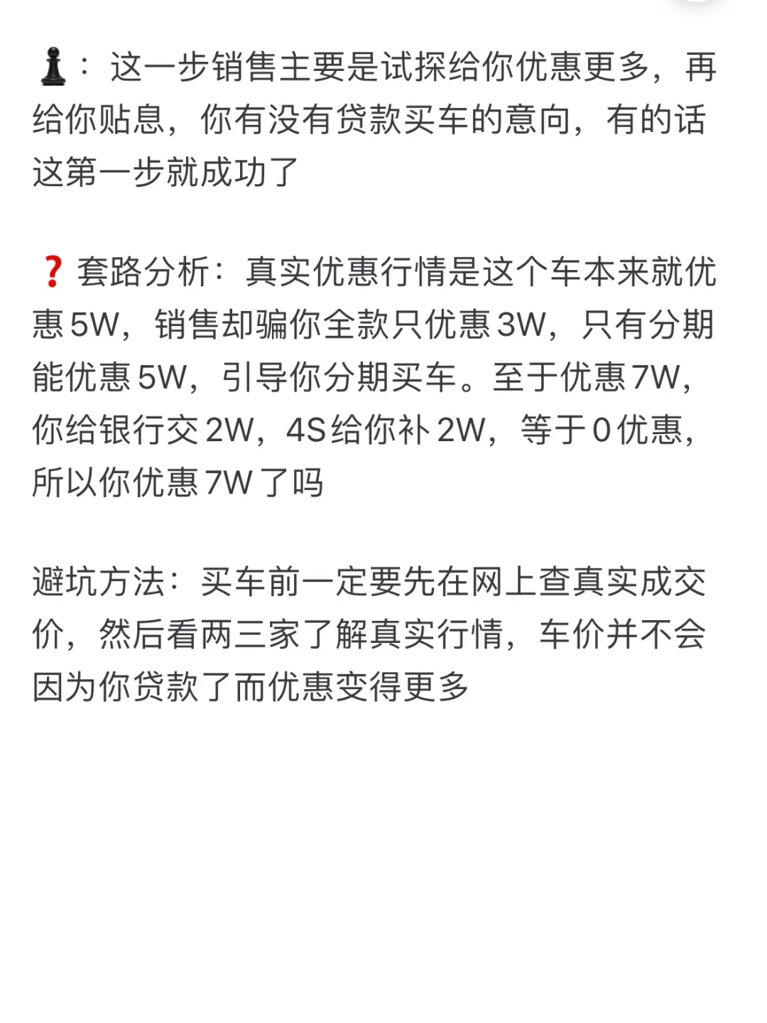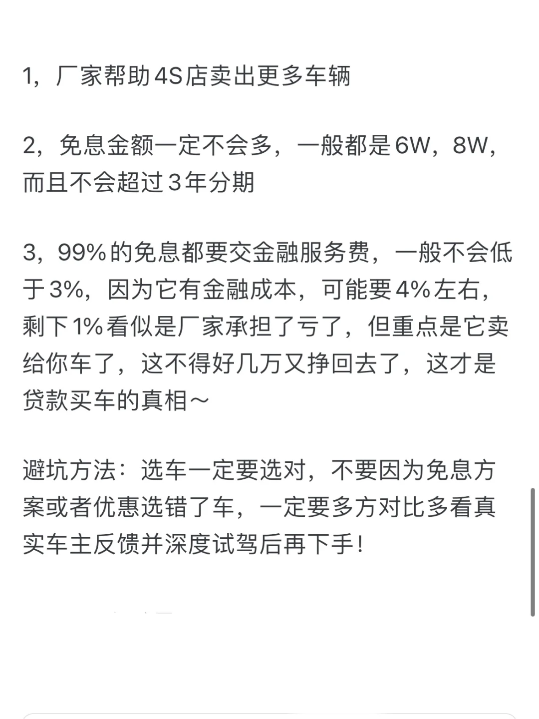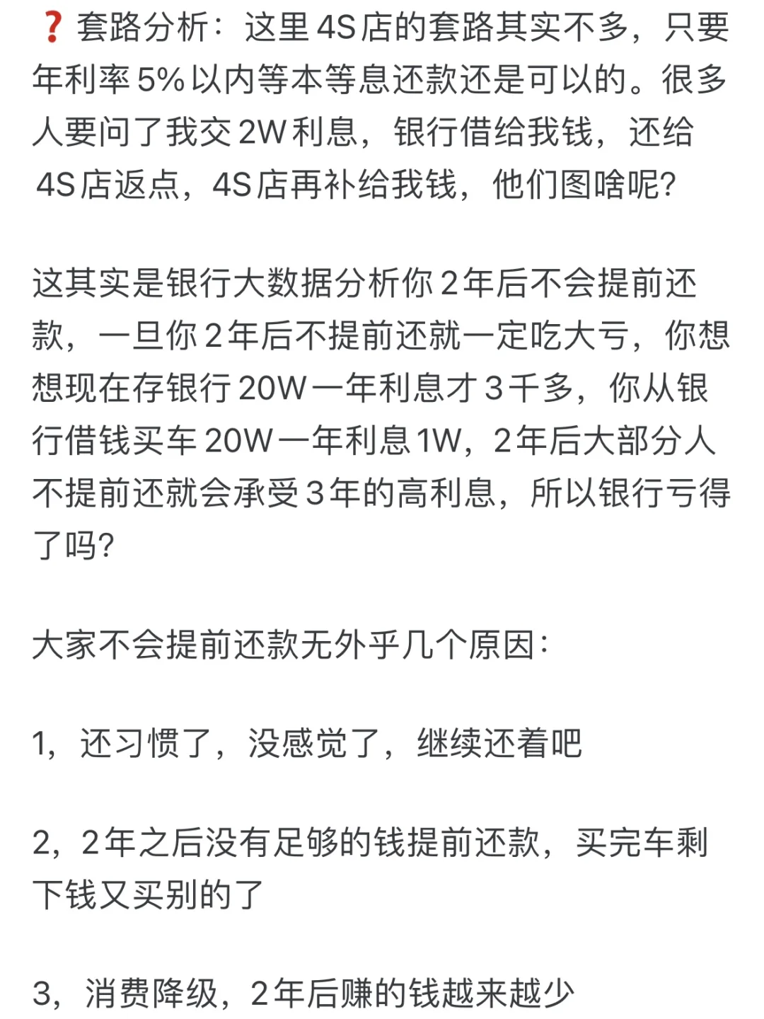 终于搞懂了两年免息的套路,水太深了。 这两天粉丝超真实反馈: 她买车销售先按4厘利息也就是年利率4.8%给她按照等本等息推算出总利息和月供,随后交给银行去推算贷款5年合同。 正好她有个朋友在银行,就告诉她银行会按照4S提供的总利息以等额本息倒推IRR利率,这样算下来前两年还给银行的利息就足够让银行给4S返点,一般还会多赚一点(如果还个3年5年,比正常的借贷利息收入多更多,所以银行是不亏钱的) 而4S贴息的金额低于利息,4S不仅不会亏钱,还能做个顺水人情,让你感觉是4S把利息补给你了,其实贴息是银行返点的一部分。 知道了上面这些套路,你就懂得即使贴息裸车价还是可以再砍一点的,放心大胆的砍,不要担心4S会亏钱。 说了这么多,个人觉得咱们买车去纠结谁亏钱谁赚钱是没有意义的,我们只需要关注自己贷款买车是否合适,不要被4S的假优惠忽悠成了多优惠,所以只要多看看别人提车的价格,自己差不多就可以了。