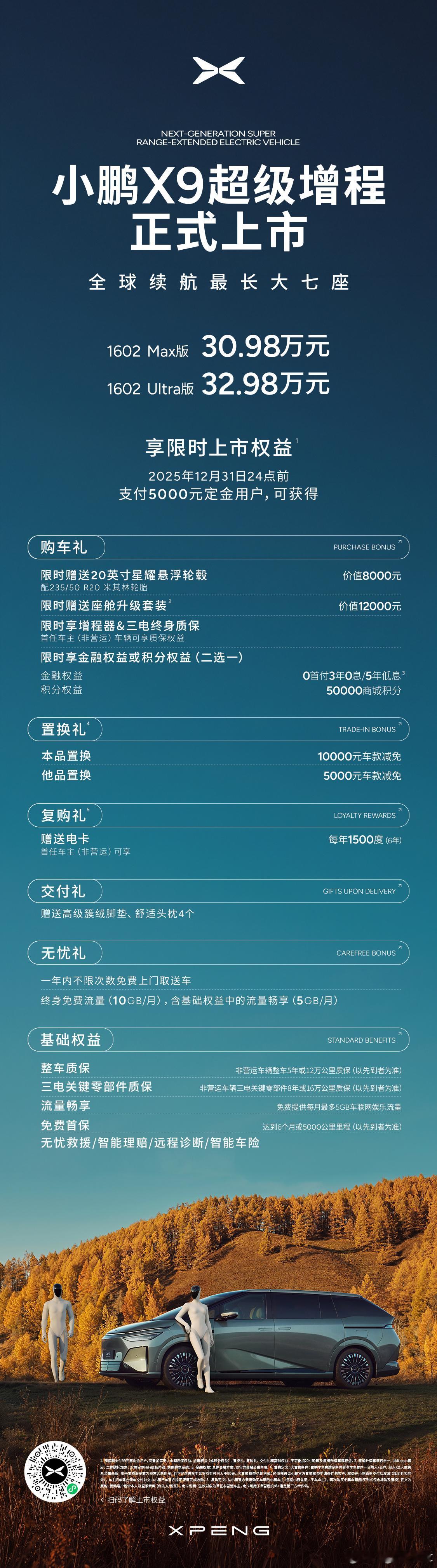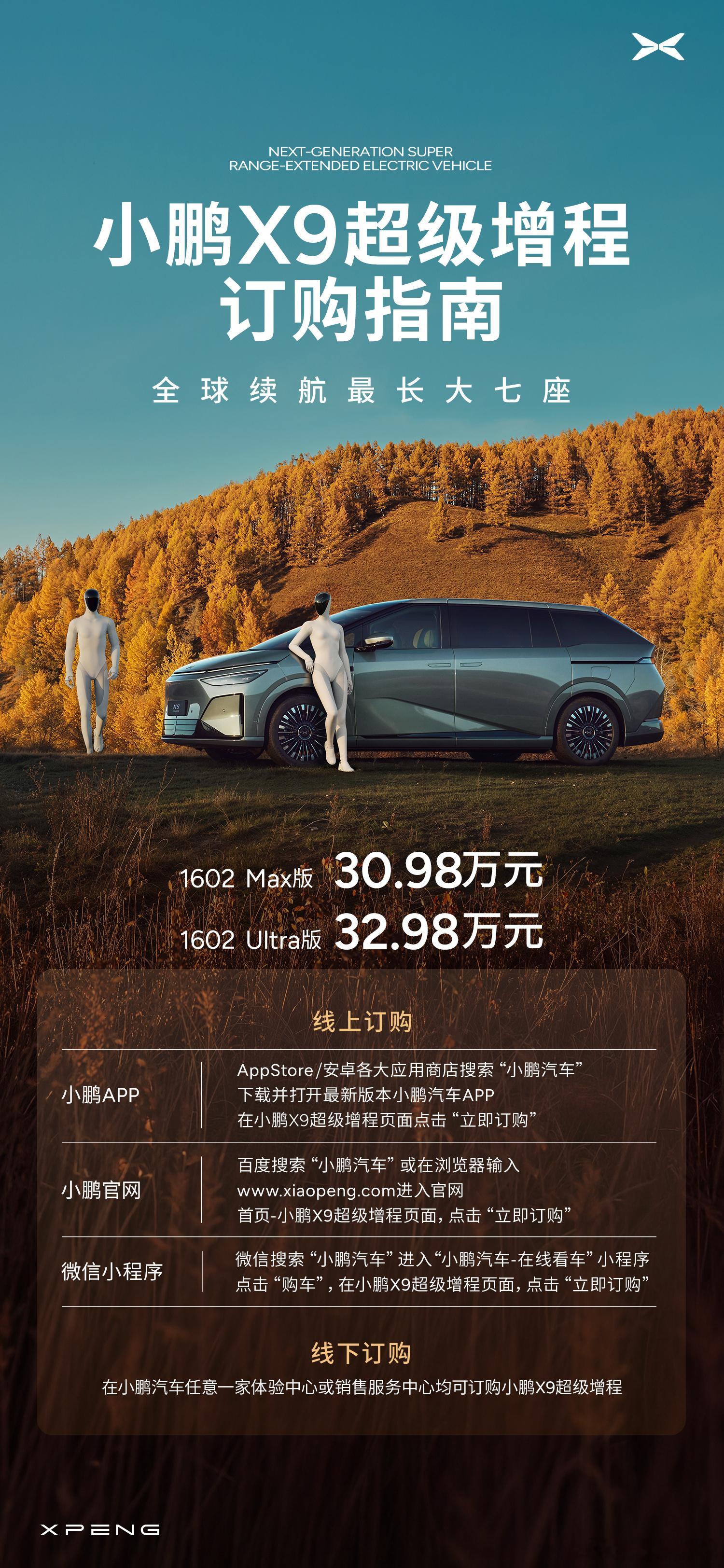 下一代增程,小鹏X9超级增程正式上市!售价30.98万元起!一台为全世界家庭而造的大七座,满足全球高规格标准,拥有可以跨越山海的1602公里超长续航,拥有让每一位家人都能感到温暖舒适的乘坐体验!