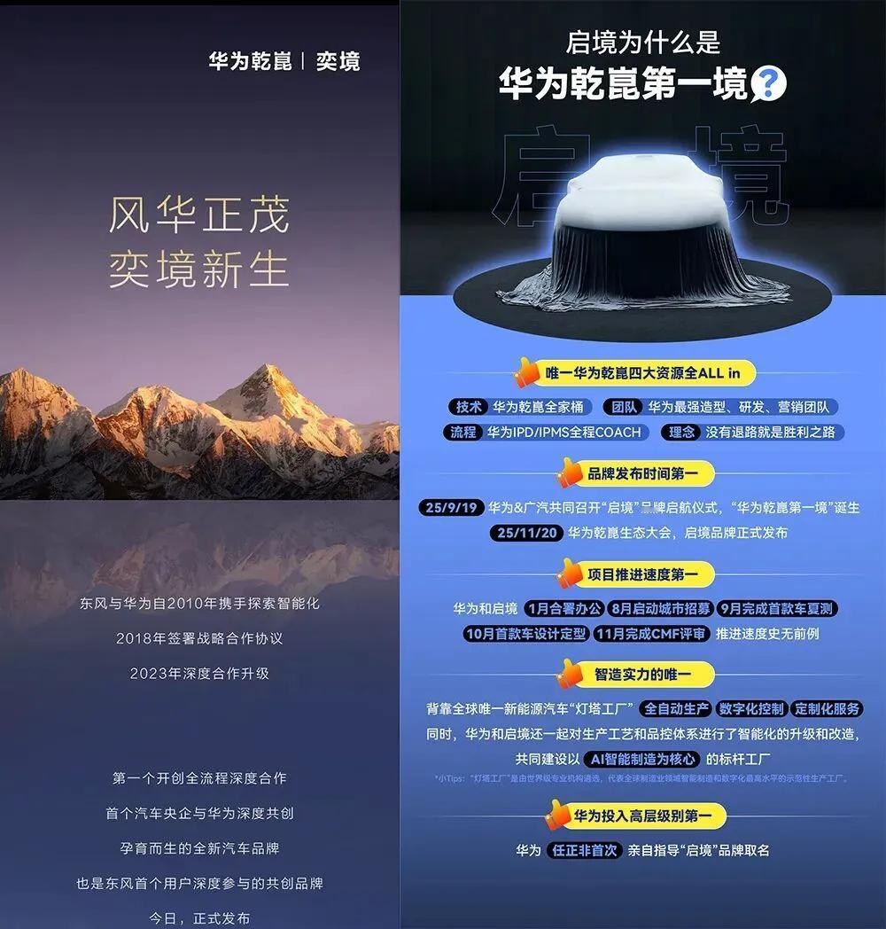 目前华为乾崑智驾合作车型达33款,这是华为公布的现状,不过仍然在扩容中,东风公司合作车型最多! 东风公司嫡系合作车型主要有岚图梦想家、岚图FERR+、追光L、岚图知音、岚图泰山、猛士M817等6款。 即便只算岚图也有5款之多,也是所有单一品牌之最。 如果再加上东风合资的东风日产天籁1款,东风自营共有7款,华为合作车型分布。 除东风自营品牌外,东风持股的赛力斯问界还有4款主力车型,因此有东风公司背景和华为合作车型高达11款。在华为合作的33款车型里目前东风已经占据1/3的份额。注,东风目前是赛力斯大股东之一【如图四所示】。 这还没有完,昨天20号,东风奕派科技和华为合作的DH项目正式定名【奕境】品牌。并于2026年4月北京车展上市第一款新车。 对启境自称“第一境”,东风奕境项目表示不服。其核心管理层在沟通中表示,车BU与车企联手打造整车品牌这一创想,三年前通过DH项目落地得以实现。因DH项目先选择了受众面更广的家用车市场,启境后来只能选择豪华轿跑方向,足以证明奕境才是真正的“第一境”。【如图三所示】 “境”系列的合作模式为车BU团队进驻车企办公。前华为车BU CMO和公关负责人带队全面进驻广州的启境办公室。奕境则是车BU的前东风集团销售团队原地升级,在武汉奋力实践“一只手托举”到“双手全力推动”。 “境”系列脱胎于华为车BU,“五界”依托华为终端赋能。微妙之处在于,车BU是乾崑智驾的操盘手,也是华为与主机厂合作的技术基石。“五界”的优势是华为终端强大的营销渠道,旗下车型同样要使用乾崑智驾。