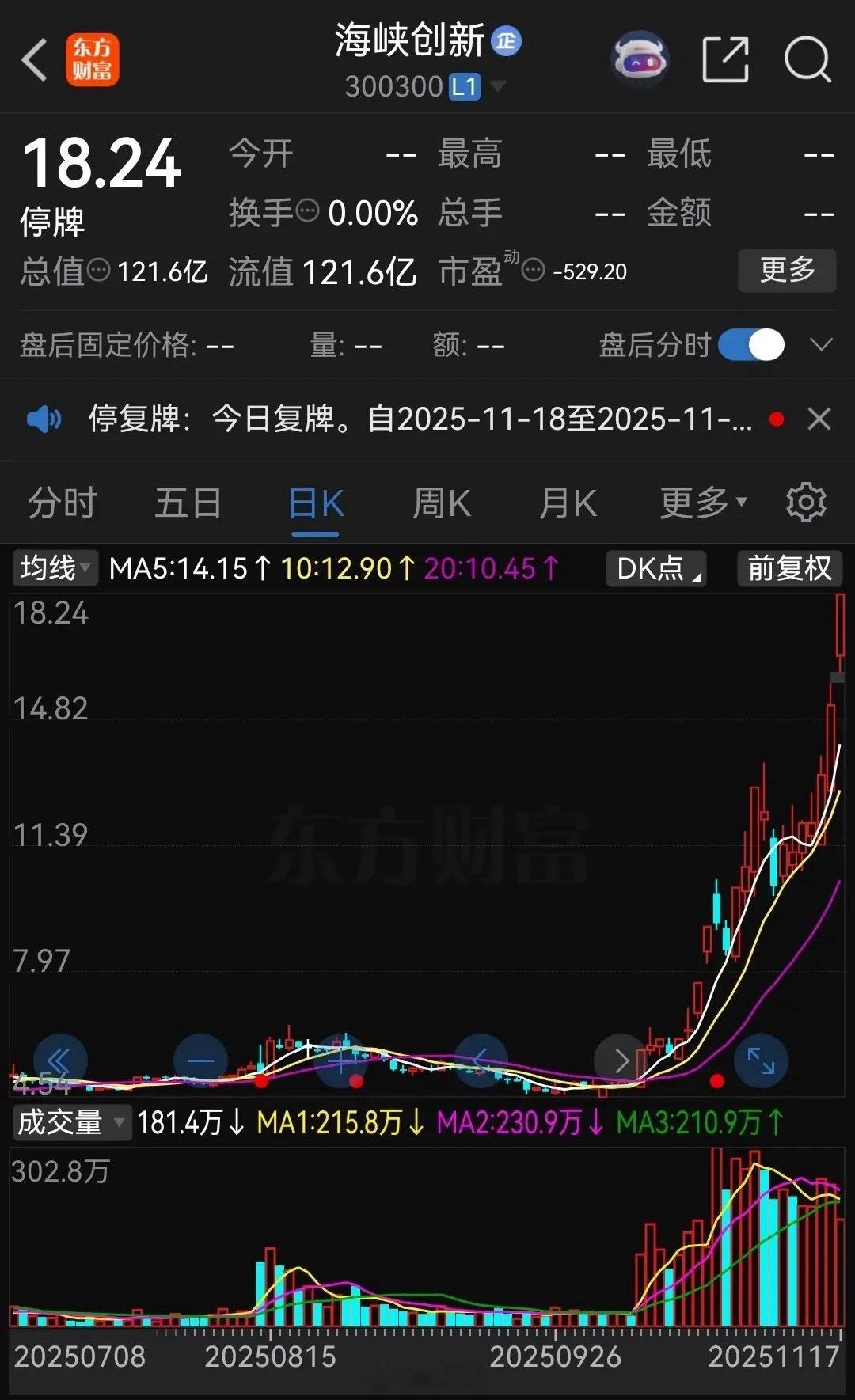 平潭发展、海峡创新两大妖股停牌核查结束,今天即将双双复牌。今天的走势非常关键,如果今天这两只龙头股能像合富中国一样继续涨停,那么将会带动福建海峡统一概念股继续上涨。如果大跌,跌停,预示着这次炒作行情将彻底结束。这波行情海峡创新涨了四倍多,平潭发展涨了三倍多,无论今天涨不涨停,已经到了最后的博傻阶段,风险极大,一不小心可能就会被挂在山顶,散户最好是不要参与。