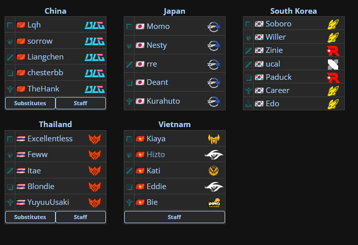 韩国队阵容包括前BFX二队上单Soboro、前BFX二队打野Willer,前KT二队中单Zinie、DRX中单ucal、前KT二队下路Paduck、前BFX二队辅助Career。值得一提的是,此前根据外媒爆料Zinie下赛季将加盟北美SR战队,Paduck下赛季将加盟欧洲BDS战队。