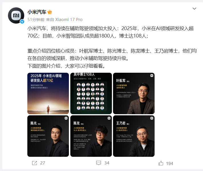 2025广州车展小米汽车副总裁李肖爽宣布小米HAD增强版正式发布!小米辅助驾驶起步晚,但投入和进步速度还是挺明显的,新版本能力挺值得期待。2025年小米在AI领域研发投入超70亿,目前小米智能驾驶团队超1800人,其中博士108人,设立了北京、上海、武汉三大研发中心。资金和人才都到位,小米要做好辅助驾驶,现在看应该只是时间问题了