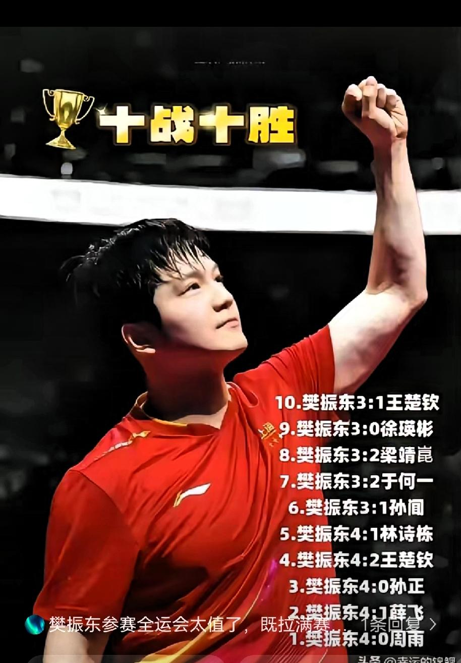 2025全运会,樊振东凭一己之力上演“三赢名场面”!十战十胜的战绩之外,还帮王励勤妥妥解决了三个关键事儿。 赛事层面,他就是“流量密码”——一参赛就带火整届全运会,不管是行业内的认可度还是大众关注度,都直接冲到顶峰,赛事地位稳得没话说。 队内层面,他成了“实力标尺”。跟王楚钦、梁靖崑的巅峰对决,对林诗栋、徐瑛彬等后辈的压制性表现,让所有现役队员都看清了差距、找准了定位,再也不敢有“自我感觉良好”的心态。 争议层面,他用状态打破质疑。之前WTT“逼退”的传言闹得凶,而樊振东以现役身份保持巅峰战力,用一场场胜利把争议压下去,还彰显了国乒的硬实力和稳定性。 3:1胜王楚钦、4:1拿下林诗栋、3:0横扫徐瑛彬,十场全胜的战绩,让樊振东不仅是赛场上的冠军,更是这次全运会的“幕后功臣”!
