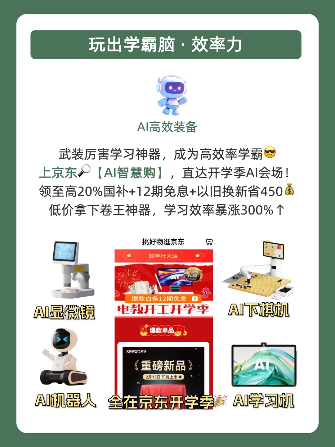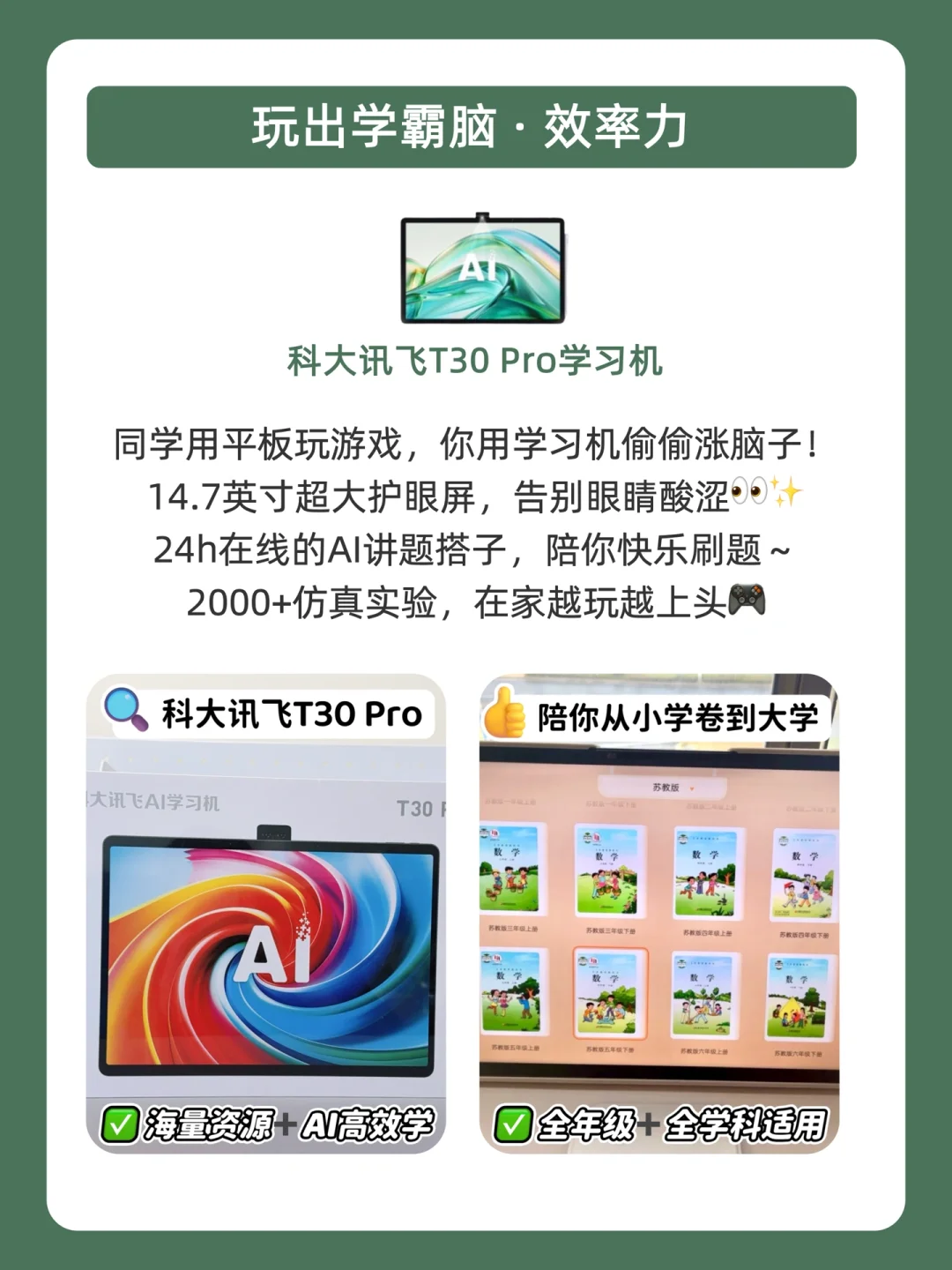 👍长年霸占年级榜前3,让鸭鸭带你校园逆袭❗️ · 👋用厉害的学习工具,就有更酷的效率!凭什么学霸不报班,不卷课,不刷题,成绩还能一路攀升!因为他们私下偷偷装备「科大讯飞T30 Pro学习机」 · 🤩AI学习机当真是效率起飞神器: 🌟AI 1对1 精准学,攻克薄弱学科知识点,带你举一反三,刷1题顶10题! 🌟AI 1对1 答疑辅导,哪里不懂问哪里,像最近很火的deepseek一样,讯飞深耕AI 有26年,用AI互动讲解,学得透! 🌟14.7英寸类自然光超大护眼屏,即使长时间学习也不怕伤眼! · 👉现在上京东🔎【AI智慧购】,就能挖到超多AI高效率数码工具,不仅可以领到至高补贴20%国补,爆款白条12期免息,部分商品支持以旧换新,最高补贴450元,嘎嘎省钱就在于此!🥳 . JD这波羊毛我已经薅到手了~除了科大讯飞的学习机之外,准备趁着国补再入手个翻译机,美滋滋! . 👍祝小宝们都能找到适合你的AI工具做变强搭子,体验学习效率飞升的爽感,2025你会强到可怕!🚀 . 🐣谢谢你的关注,我是鸭鸭,持续分享更多高质量的学习方法,陪宝子成为学霸,风云校园!