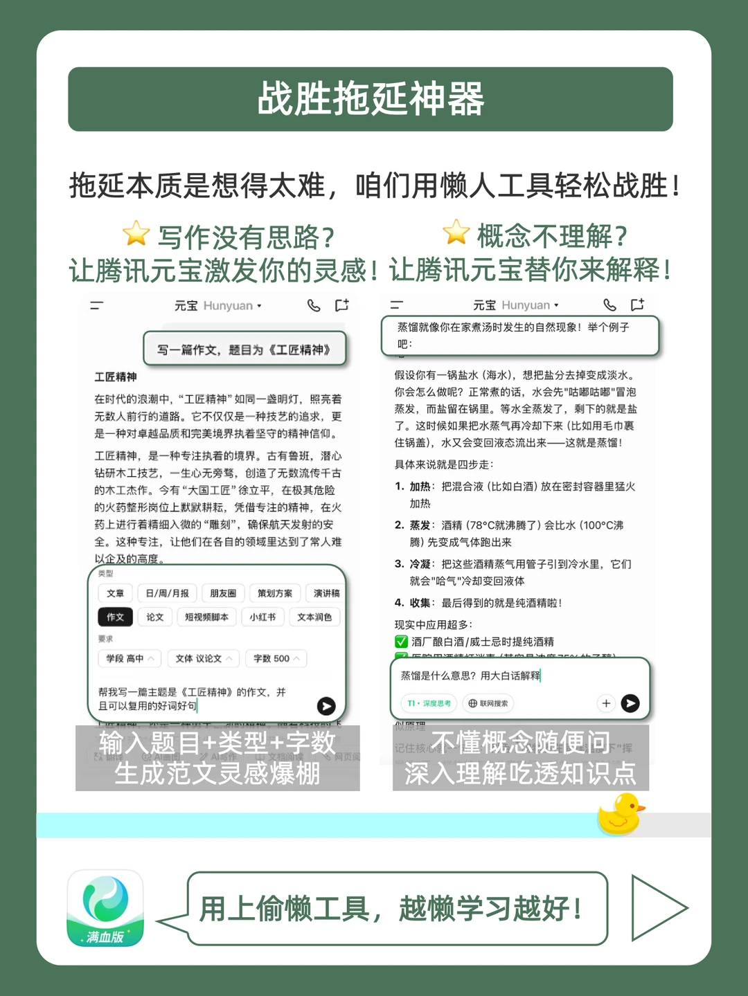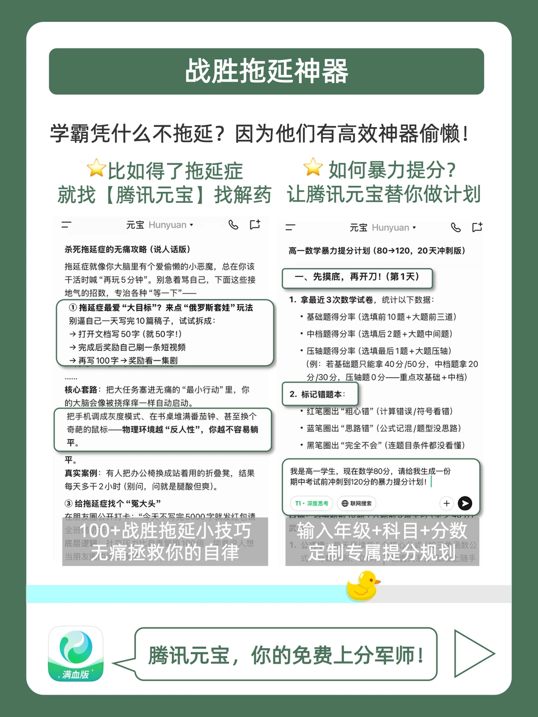 [赞R]学习拖延不用怕,鸭鸭带你秒自律❗️ . [点赞R]快速杀死拖延症,弯道超车就在于此🚀 . [向右R]学霸凭什么不拖延,复习效率那么高?因为他们都用工具偷懒! . 比如找学霸搭子APP【腾讯元宝】陪你一起备战考试,不懂题目拍照答疑,解析秒出嗖嗖快,让你学1小时顶别人8小时❗ 🐣我是鸭鸭学长,持续分享更多学霸秘籍,陪小宝们学习开窍,考试开挂!