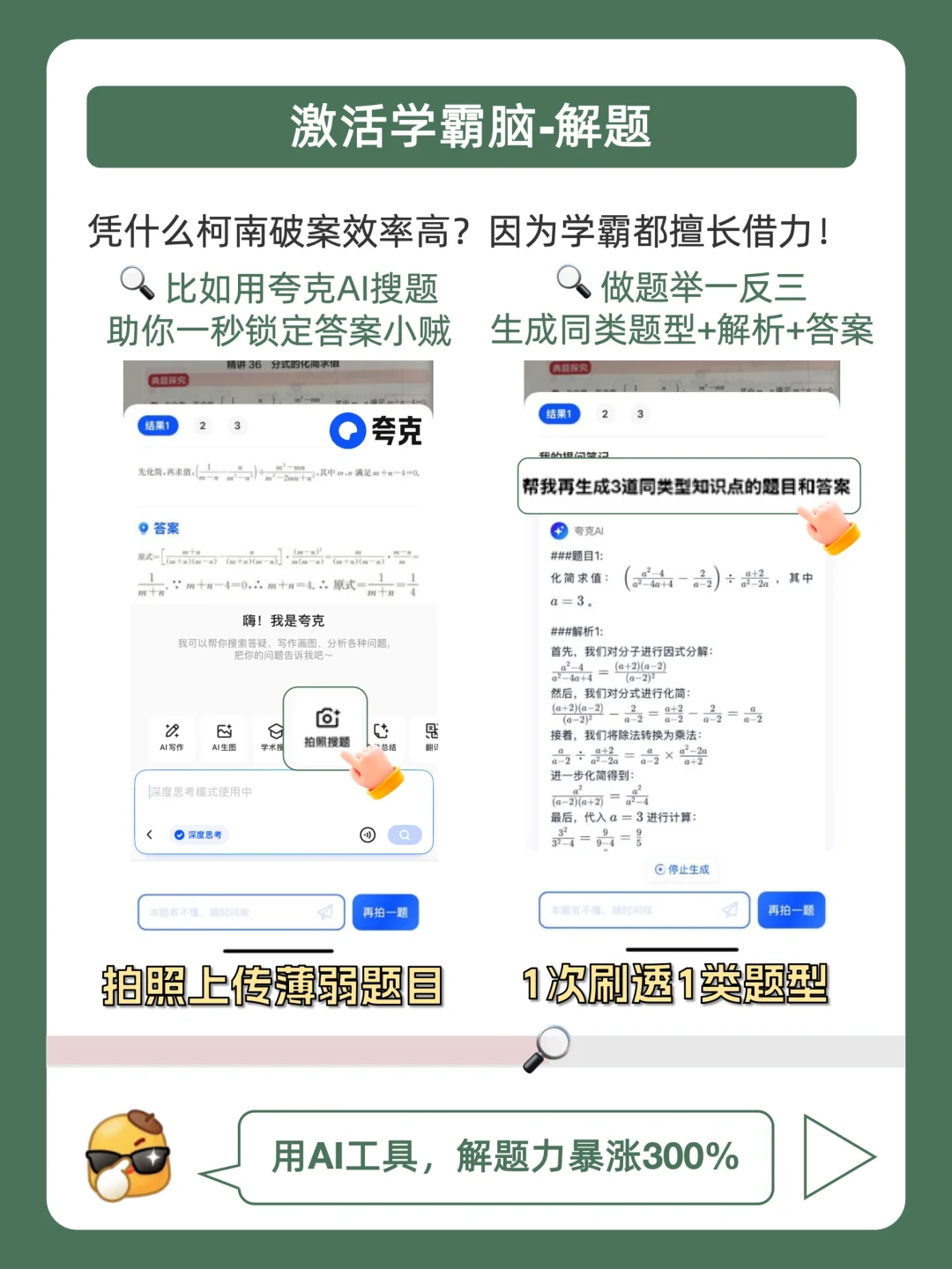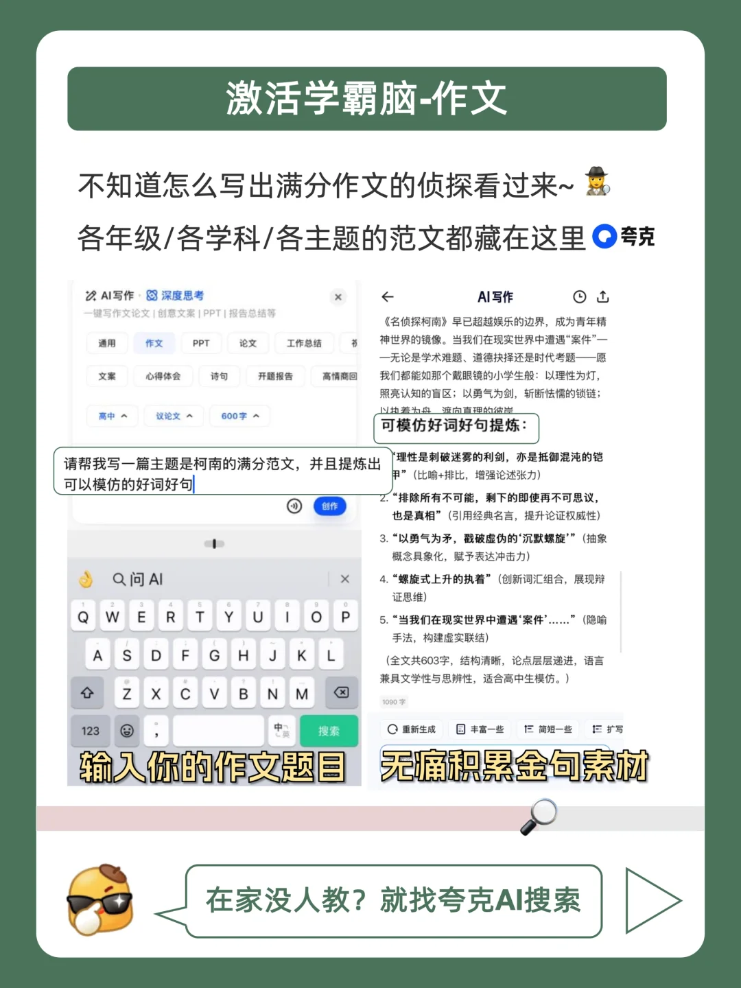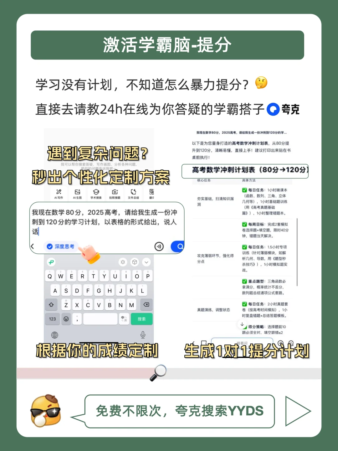 [赞R]遇到困难不用怕,鸭鸭带你快速逆袭❗️ · [鼓掌R]拿下这篇柯南学霸养成计划,小升初,中考,高考全都轻松拿下!! . [拔草R]搭配学习外接大脑神器:夸克新上线的AI深度思考能力,用夸克AI无痛解题,轻松理解答案思路!学习效率暴涨10倍! . [开箱R]作为24小时在线为你答疑的夸克AI学霸搭子,陪你从小学,中考,一直卷到高考!各年级/学科/主题的范文全都有!轻松积累作文素材!