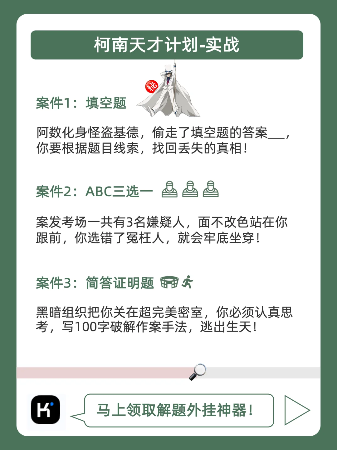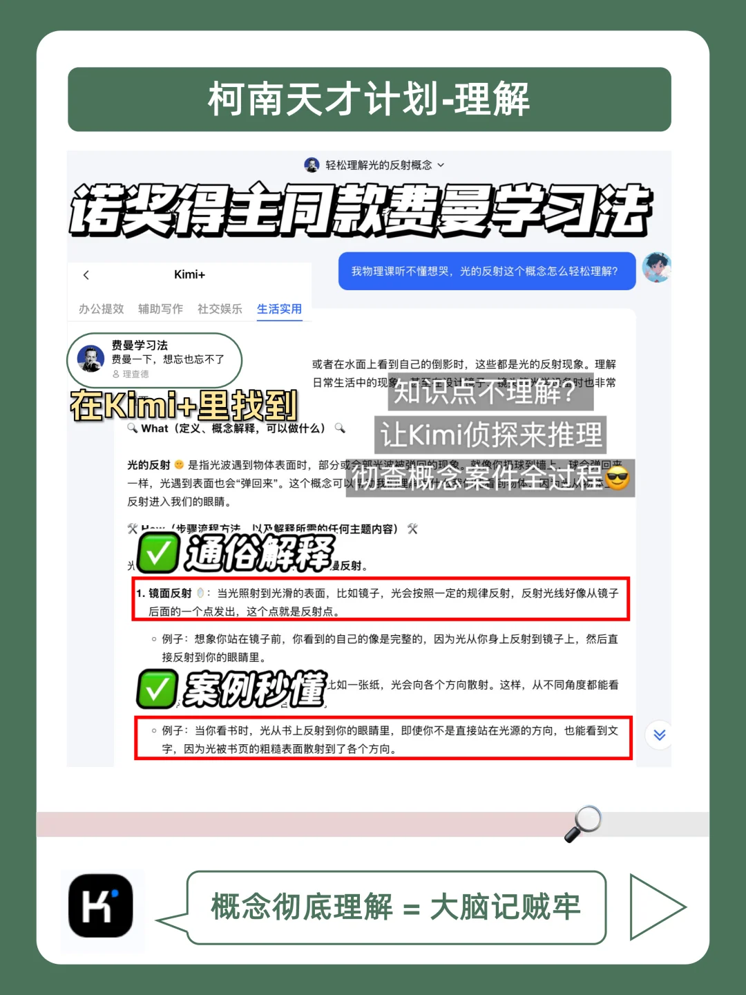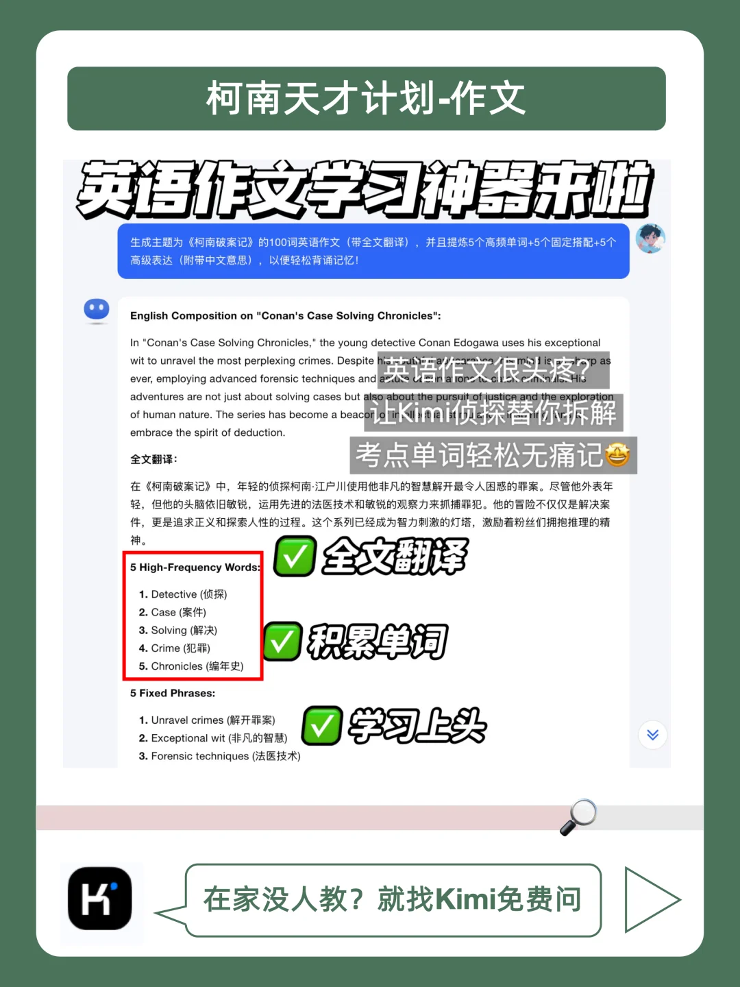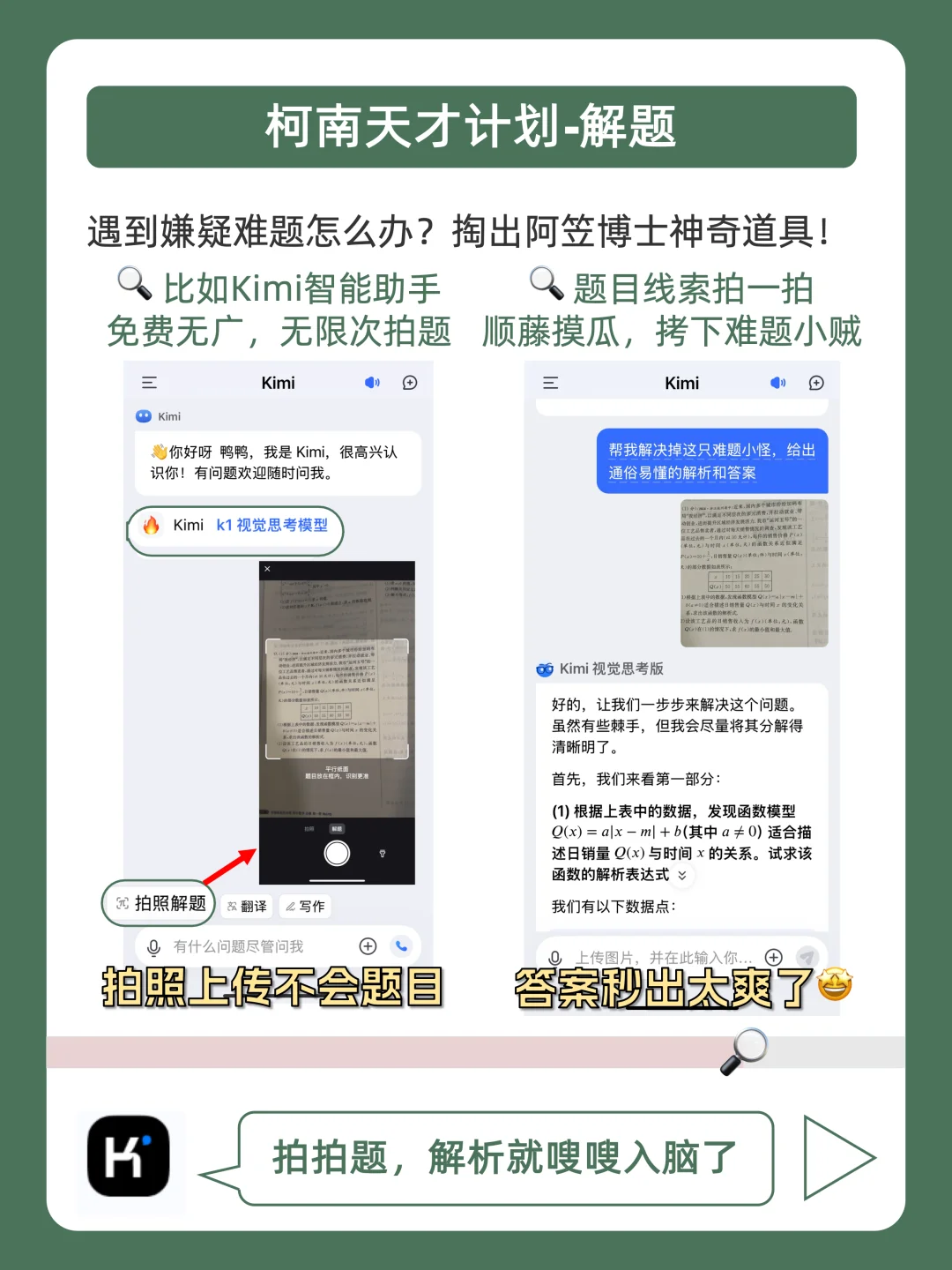 [赞R]讨厌学习不用怕,鸭鸭带你学上头❗️ · [派对R]拿下这篇柯南学习法,学嗨玩爽就在于此!🚀 . [偷笑R]赶紧学起来,这可是学霸间不轻易透露的秘密❗ . [向右R]马上期末考试了,很多同学被黑暗考试组织耍得团团转。别慌!咱们可以借助阿笠博士分享的Kimi智能助手!辅助咱们高效破案解题!光速破解考试难题的作案手法,挖到答案解析,成绩轻松暴涨💯 · 作业难题不会?马上拍照给Kimi,秒解难题出答案 知识点不理解?让Kimi来通俗易懂解释,秒懂概念 英语作文头疼?呼唤Kimi,帮你轻松积累地道表达 单词过目就忘?请教Kimi,帮你编成故事轻松理解 · 🐣我是鸭鸭,持续分享更多趣味学习法,陪宝子们学习开窍,考试开挂!💯