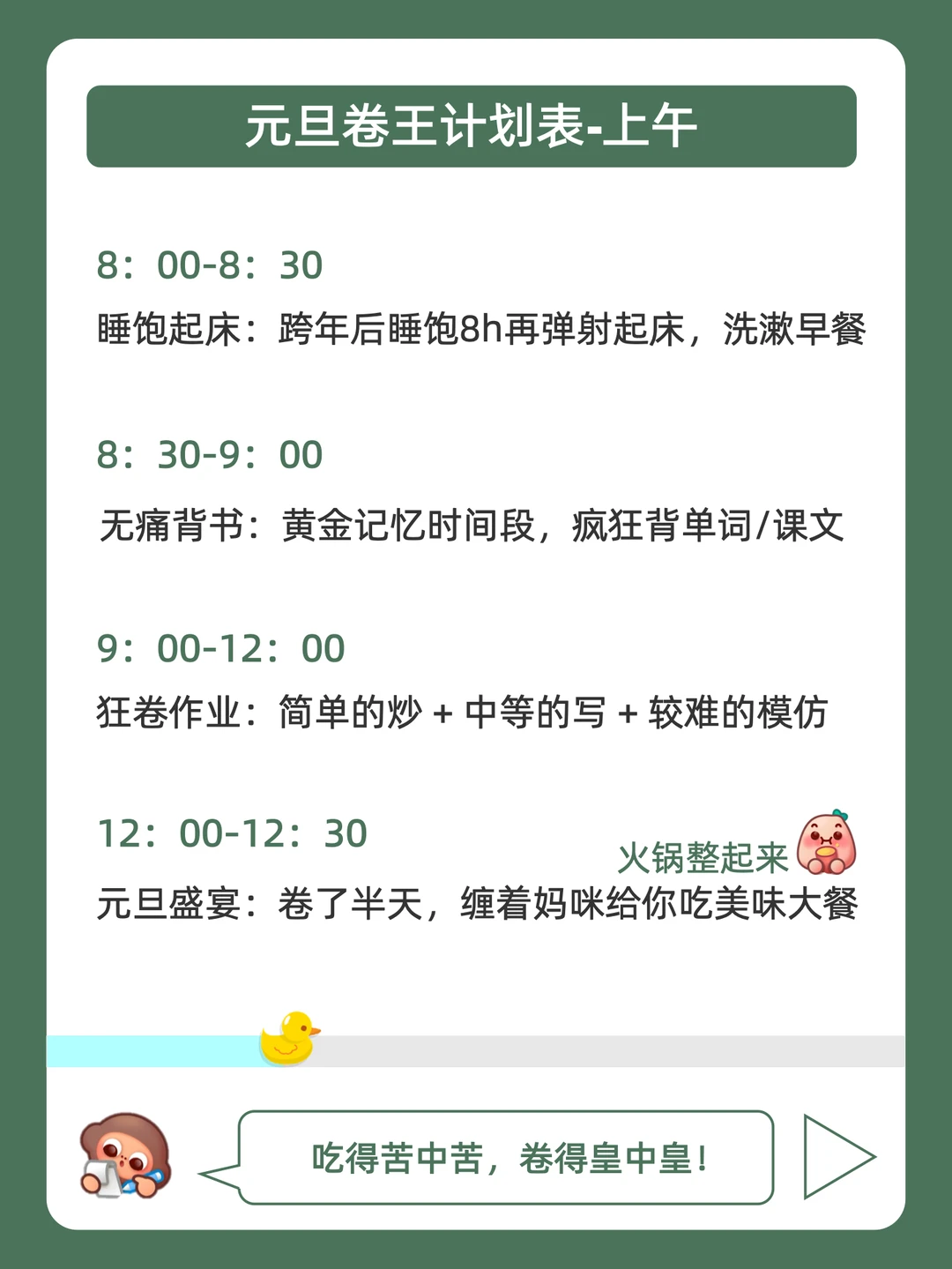 [赞R]假期迷茫不用怕,鸭鸭带你做规划❗️ · [哇R]这个元旦偷偷卷起,期末超车就在于此!🚀 . [偷笑R]赶紧学起来,榨干元旦节悄悄逆袭当学霸❗ . 🐣我是鸭鸭,持续分享更多学霸秘籍,陪宝子们学习开窍,考试开挂!💯