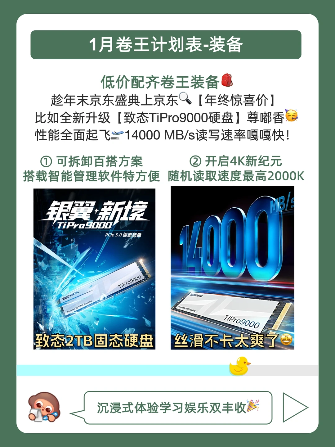 比如电脑内存不够用?新年可以试试换新装备致态TiPro9000固态硬盘,超高速丝滑不卡特流畅,快速拷贝大型视频文件,完全不用担心卡顿!安装大型游戏更迅速,寒假还能体验黑神话悟空奖励自己!学习娱乐两不误!