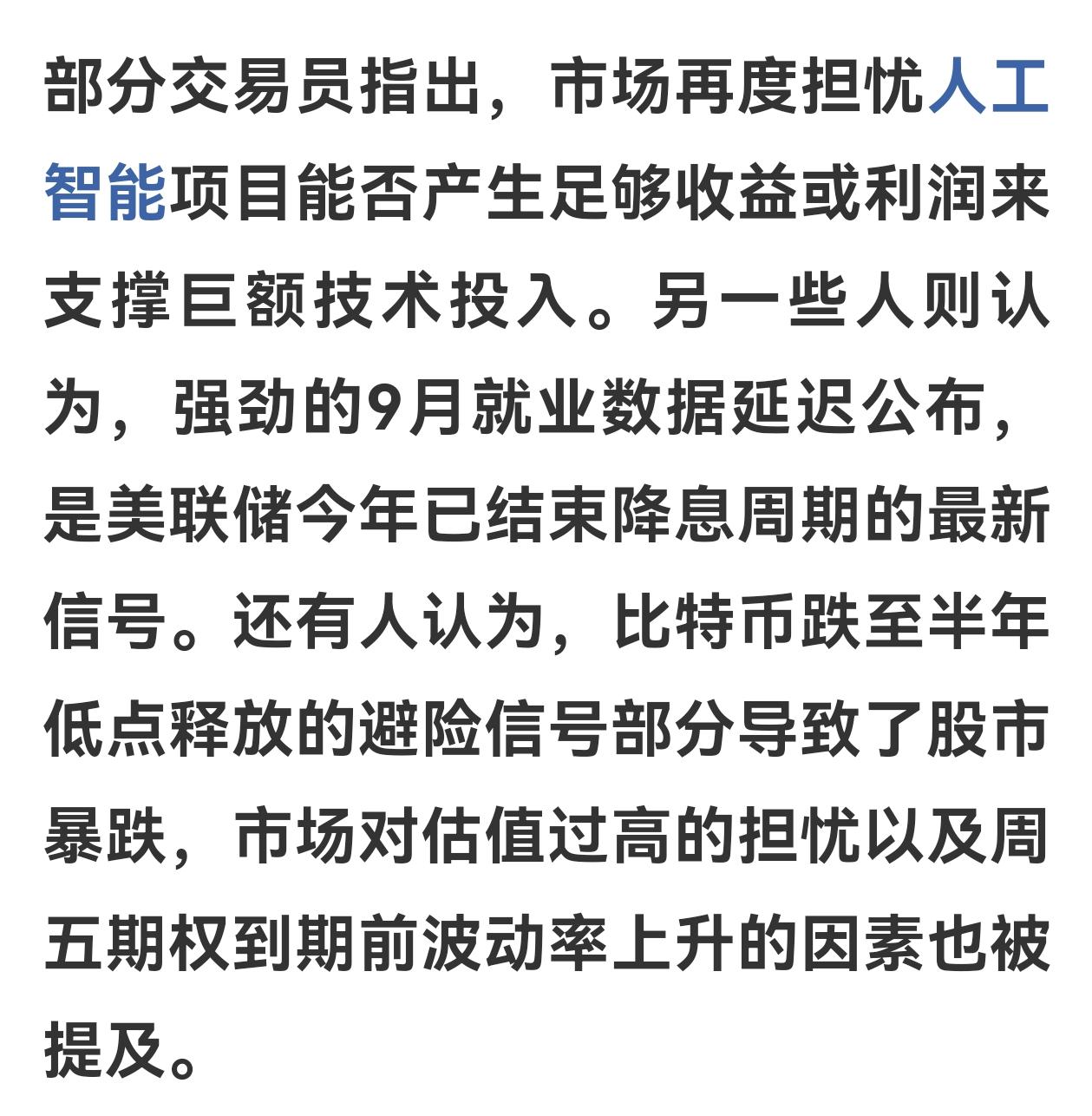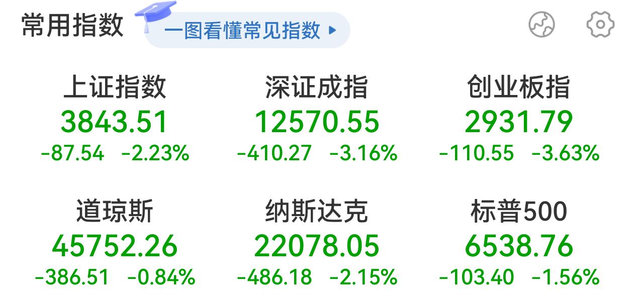 美股: 道琼斯跌0.84%,纳斯达克跌2.15%,标普1.56%; A股:上证指数跌2.23%,深圳指数跌3.16%,创业板跌3.63%。 为什么会这样?美股担忧人工智能泡沫、强劲就业数据可能导致美联储不再降息,恐慌情绪导致美股大跌了!A股没有其他利空,A股估值处于低位,外围下跌让A股跌得更猛,5000多只个股下跌,成交量放大17%,半天主力资金净流出1100多亿,这是不是有些过头了! A股科技股10月进入调整,创业板指数调整了12%,许多个股调整到30—40%了;银行股近期成了A股的稳定器,逆势护盘维持大盘的基本稳定。但今天科技股领跌市场,银行股也放弃了护盘,市场放量下跌,显示恐慌情绪有所蔓延。 A股独立性有所增强,近期几次受外围冲击后,都能成功很快收复失地。巩固资本市场回稳向好的政策没变,关键时候GJD应该会出手;国内经济回暖,公司盈利增强,会对股市形成有效支撑;年底要完成年度经济目标,明年经济要开好局,一般会有相应政策配套出台。年底机构要锁定今年的收益,部分投资者也会落袋为安,导致部分筹码抛出,但不宜过度悲观。