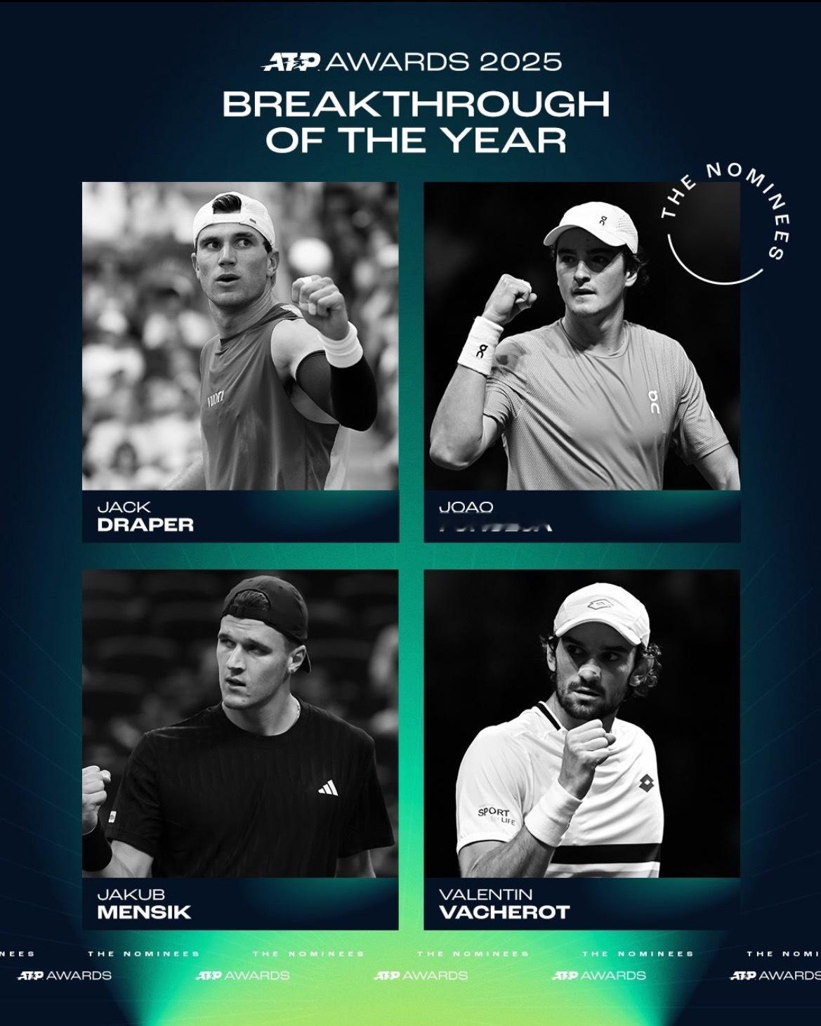 2025ATP年度奖项提名公布:年度突破球员:德雷珀丰塞卡门希克瓦舍罗年度最佳教