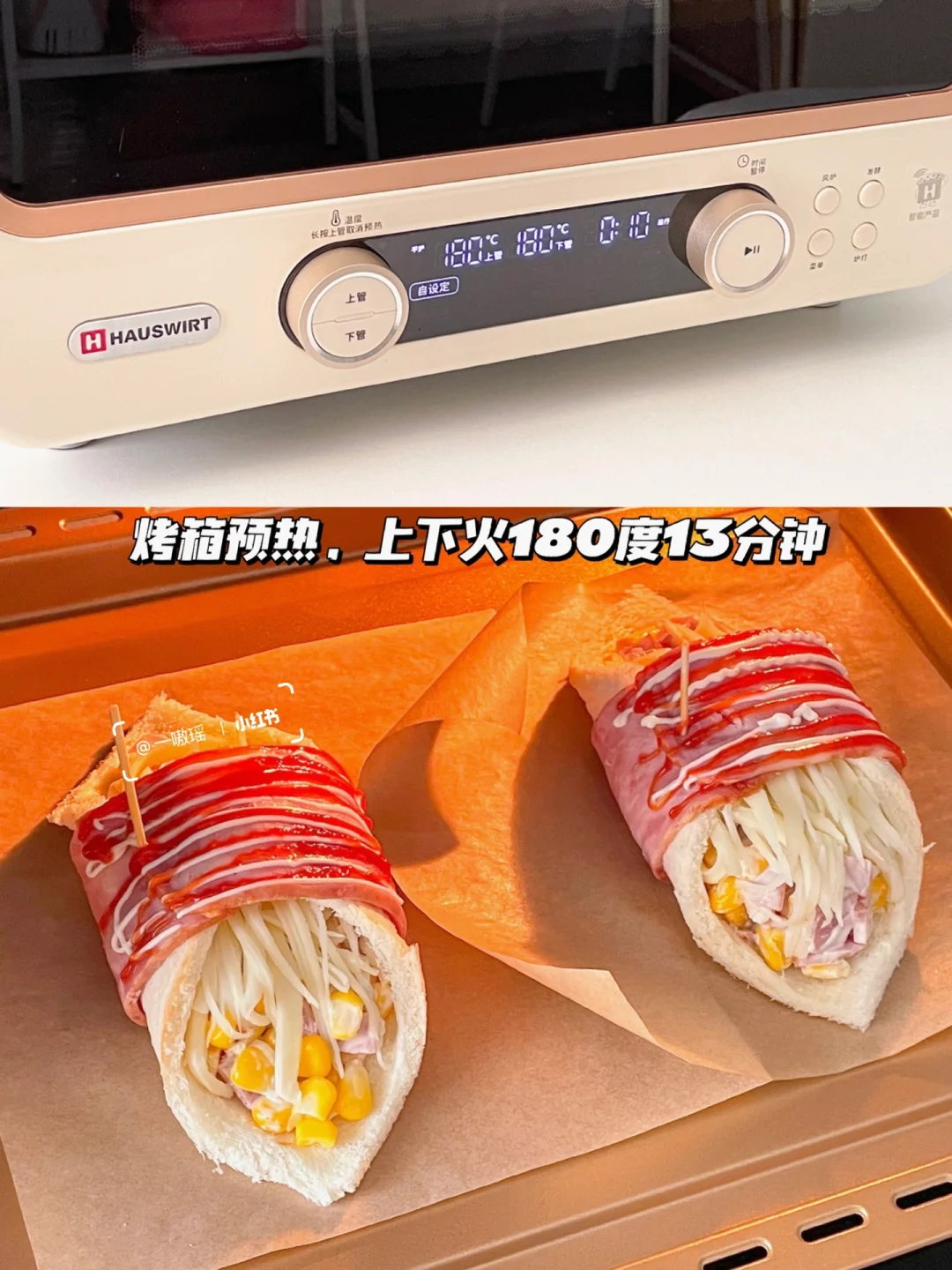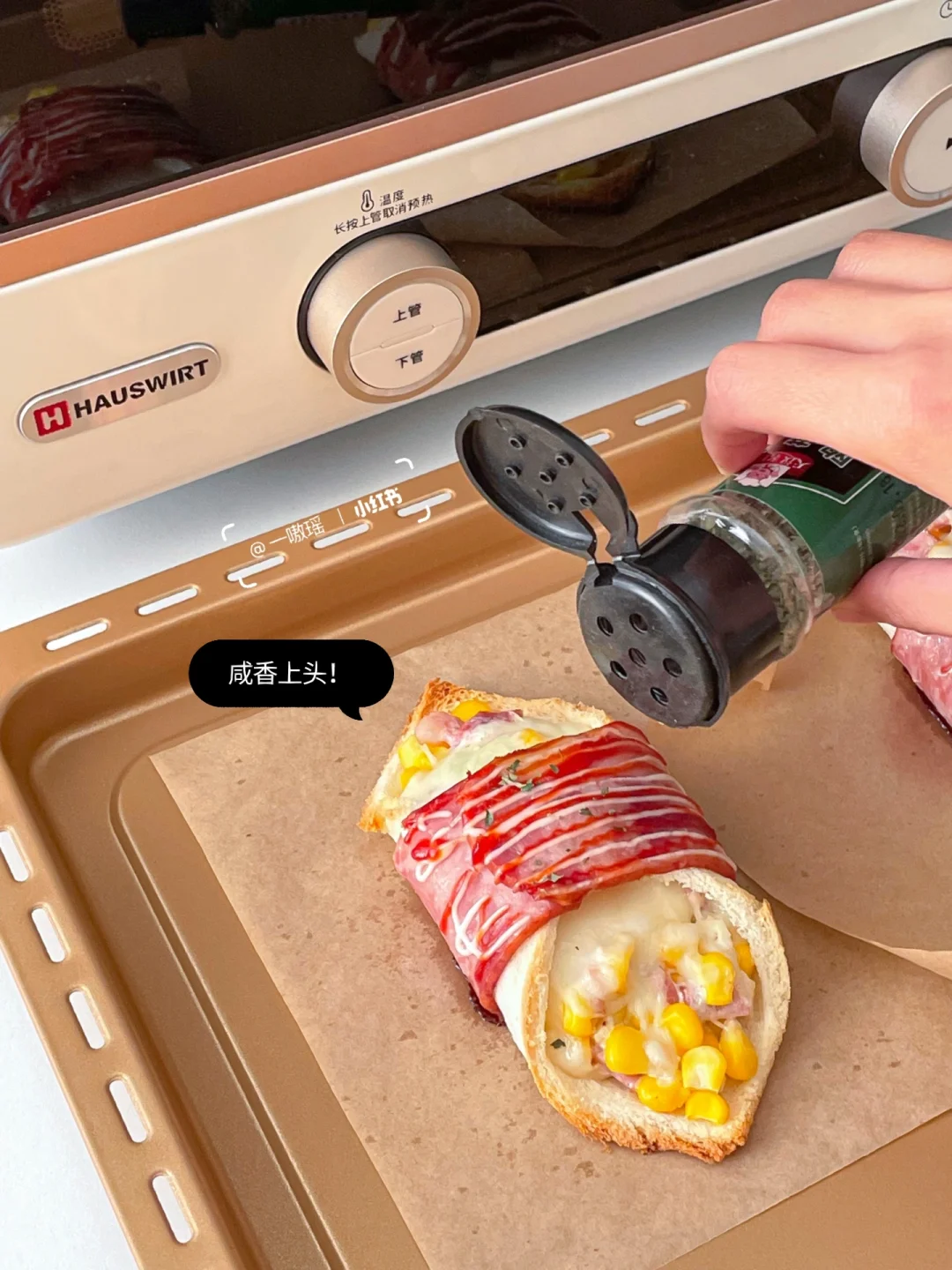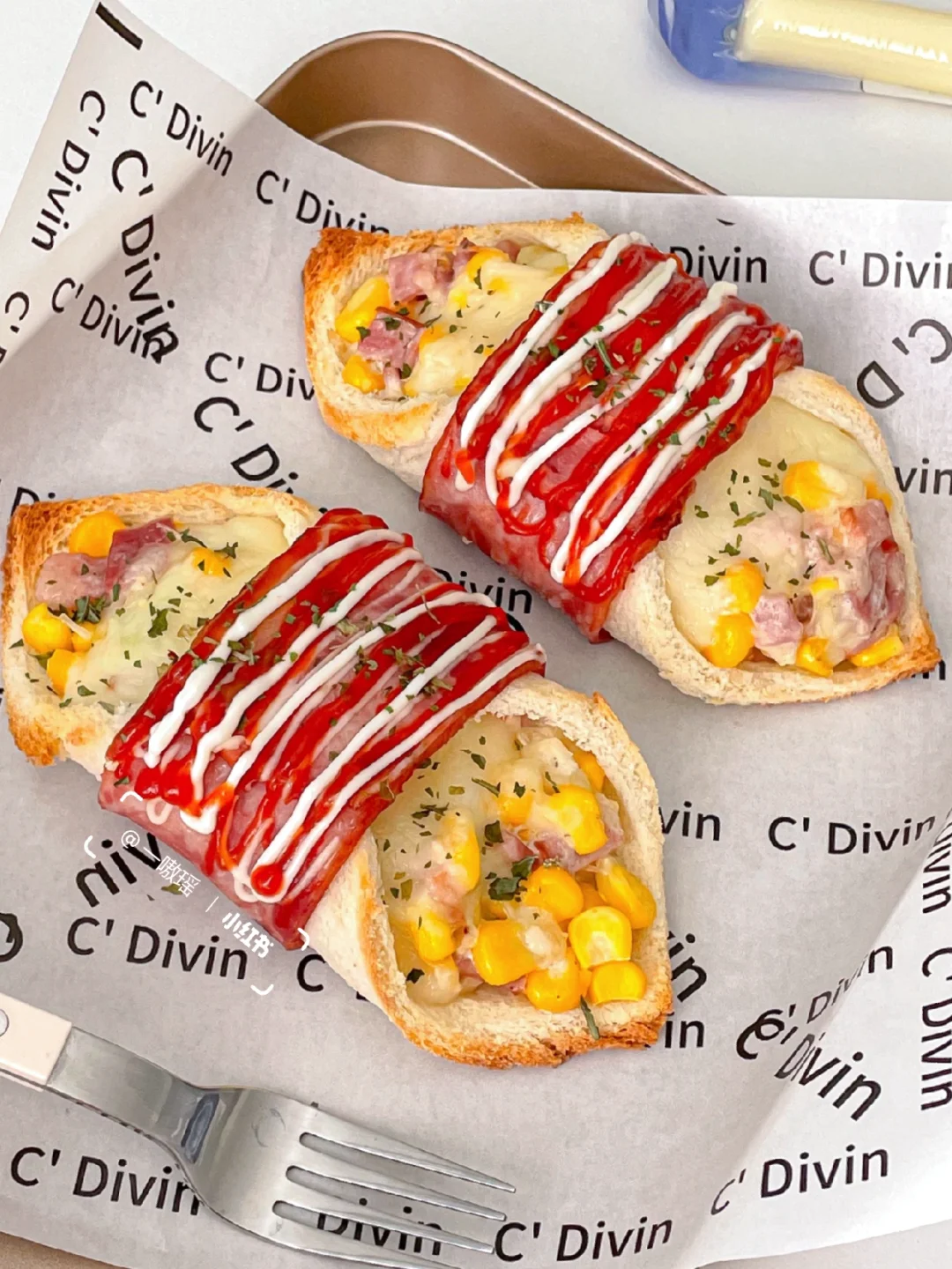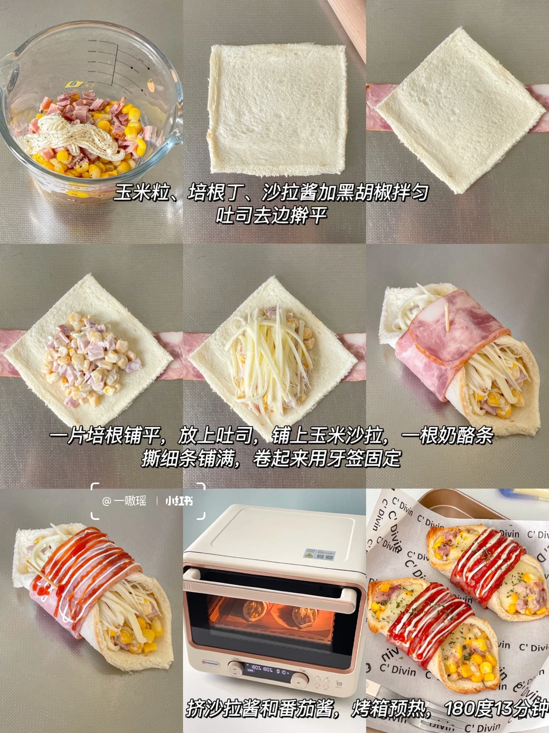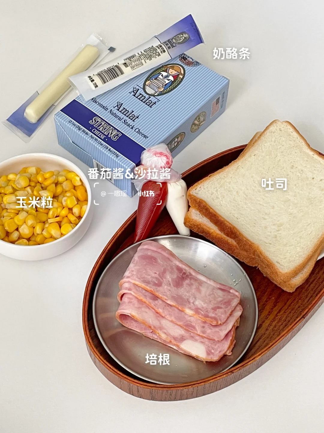 吐司2片 培根3片 玉米粒 手撕奶酪棒2根 沙拉酱 番茄酱 黑胡椒 欧芹碎(没有可不加)