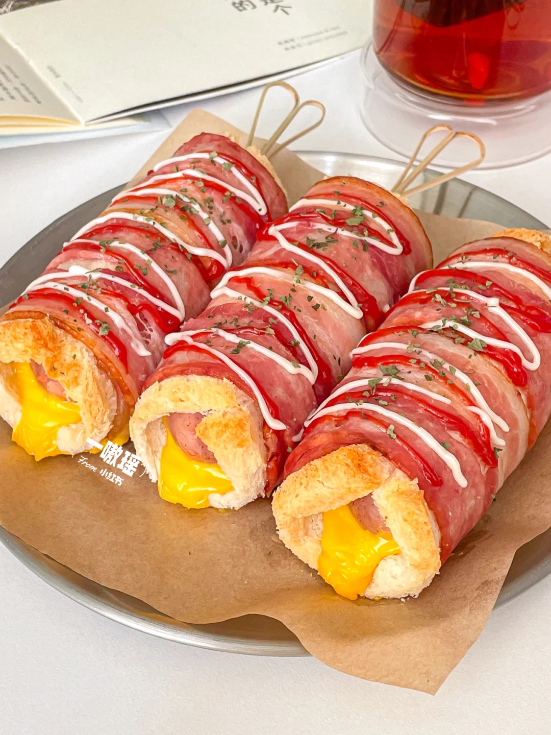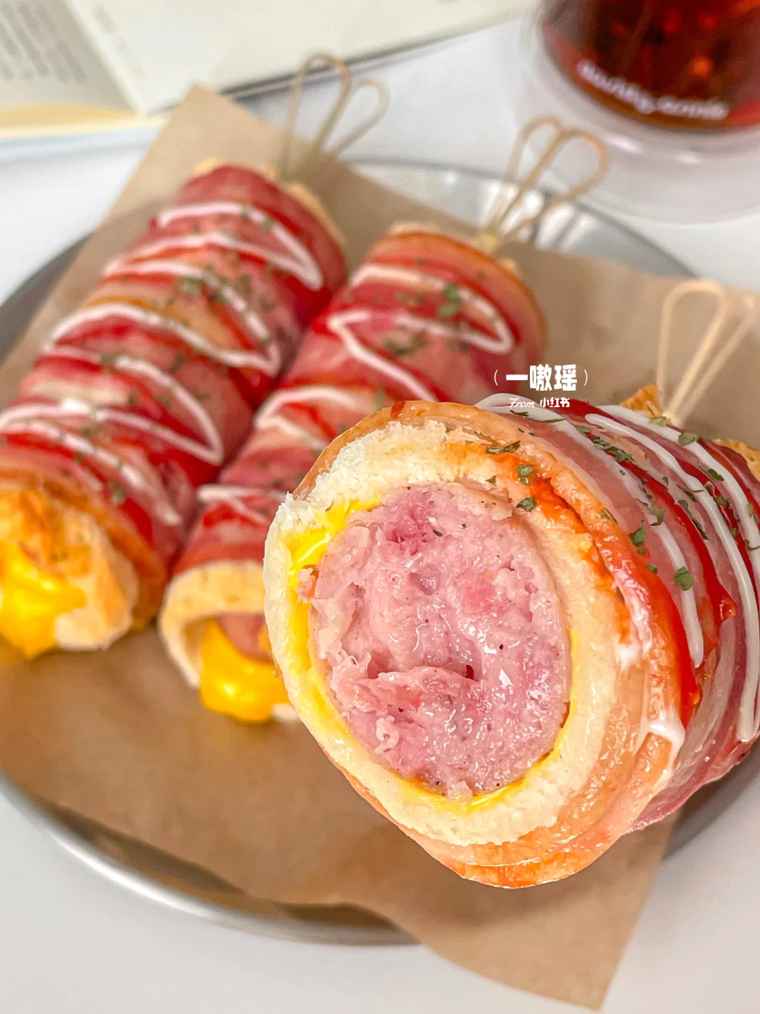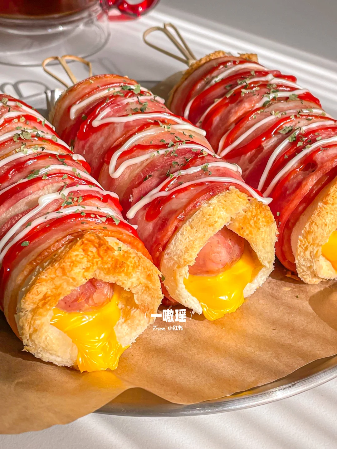 健康快手的懒人早餐也可以如此幸福😆 吐司烤过之后酥脆掉渣,爆炸香💥爆汁烤肠和烟熏培根🥓混合浓郁的芝士🧀,一口大满足 - 🛒食材 吐司 烤肠 培根 芝士片 番茄酱 沙拉酱 👩🏻🍳做法 •吐司去边擀薄 •两片培根上依次放吐司、芝士片、烤肠卷起 •烤箱预热,上下管180度20min,出炉挤番茄酱和沙拉酱,撒欧芹碎