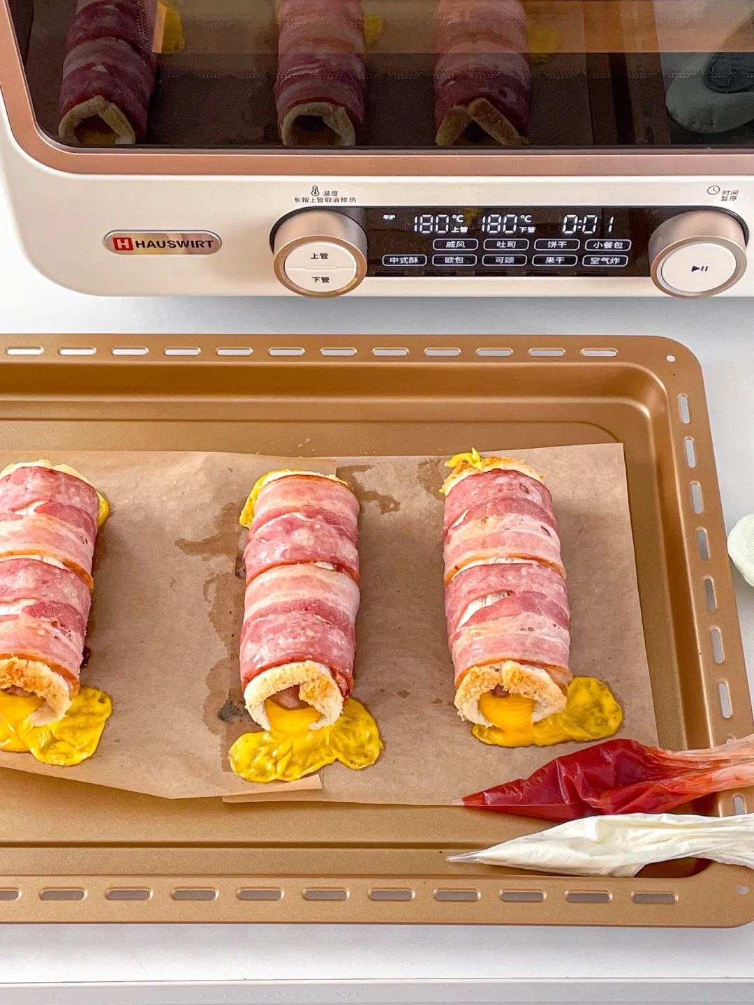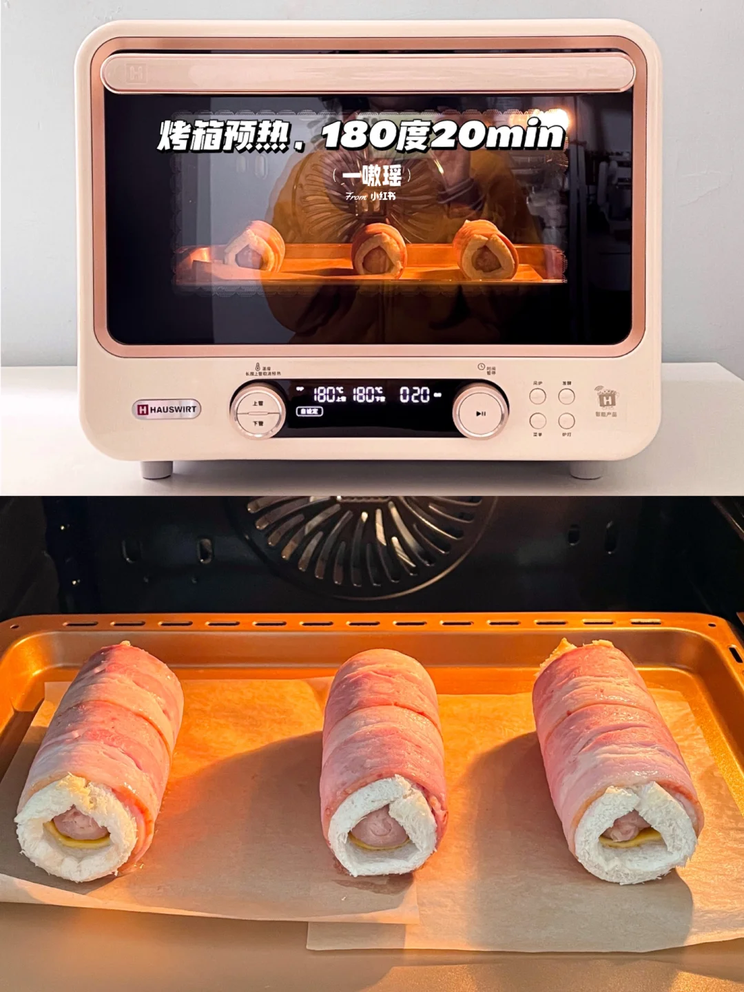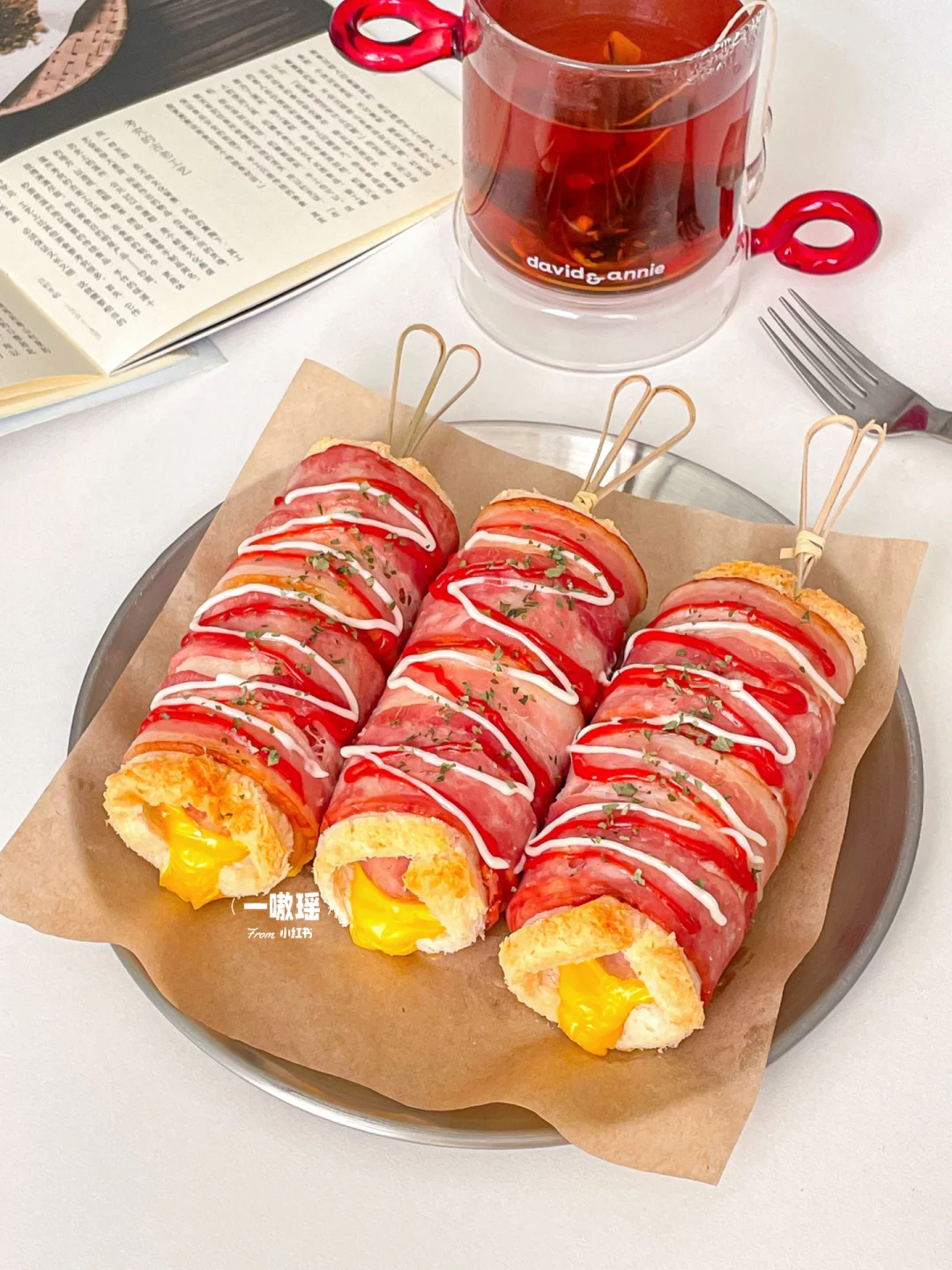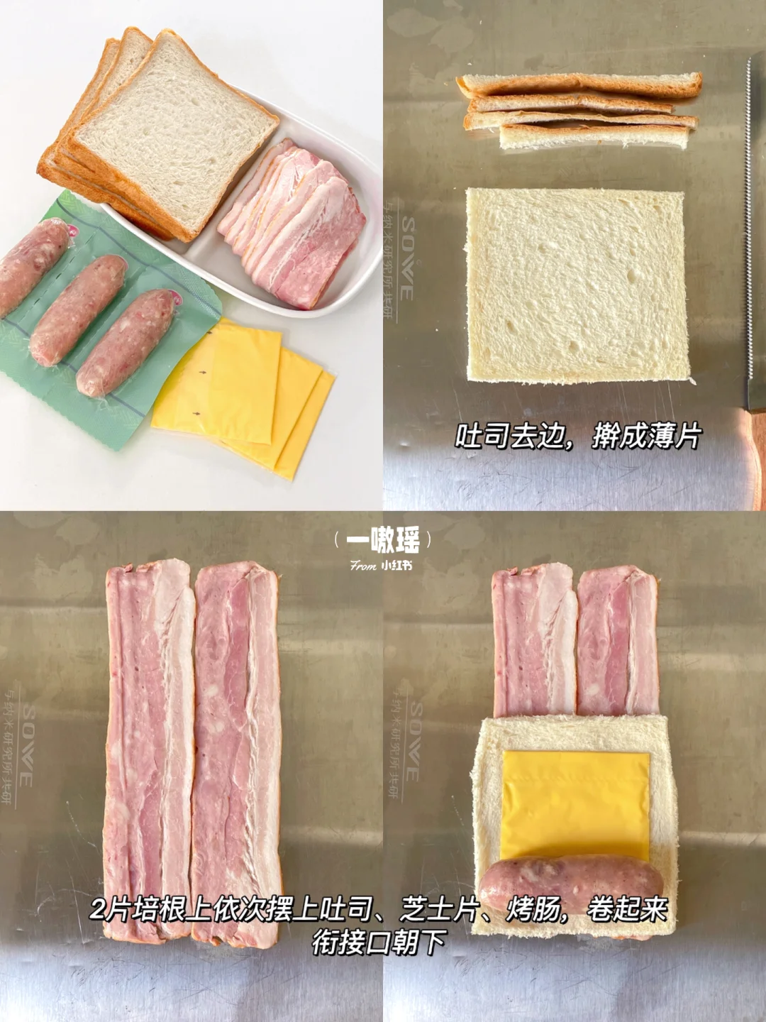 健康快手的懒人早餐也可以如此幸福😆 吐司烤过之后酥脆掉渣,爆炸香💥爆汁烤肠和烟熏培根🥓混合浓郁的芝士🧀,一口大满足 - 🛒食材 吐司 烤肠 培根 芝士片 番茄酱 沙拉酱 👩🏻🍳做法 •吐司去边擀薄 •两片培根上依次放吐司、芝士片、烤肠卷起 •烤箱预热,上下管180度20min,出炉挤番茄酱和沙拉酱,撒欧芹碎