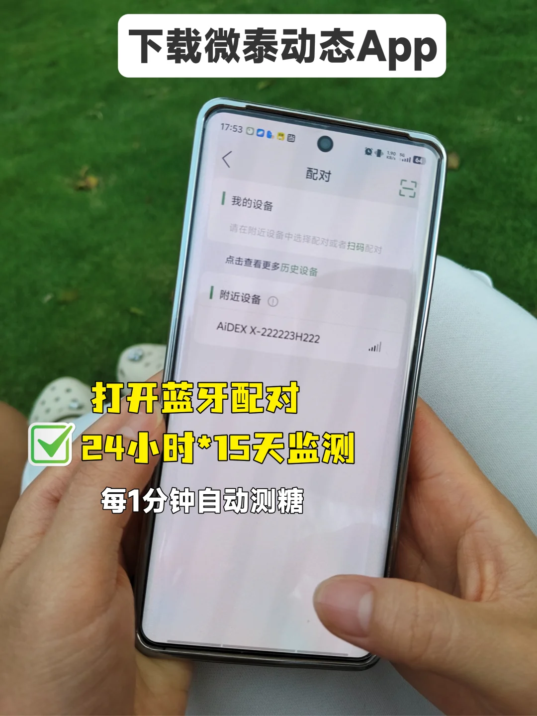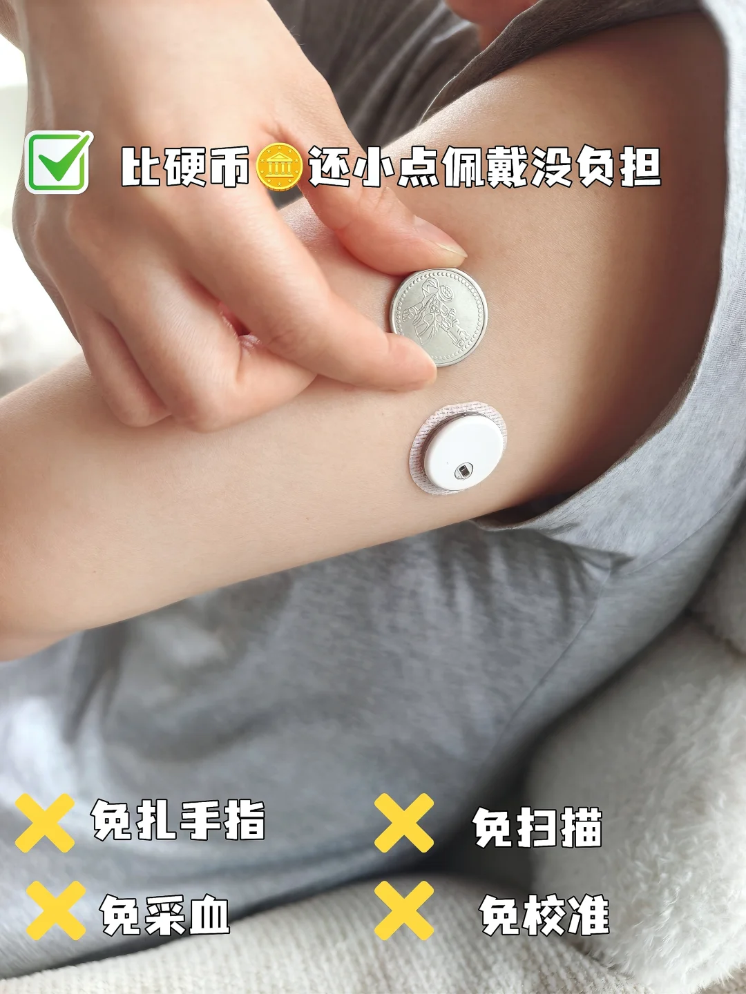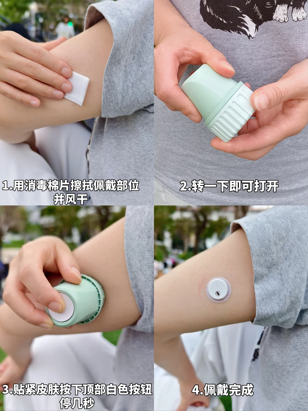 它跟传统的指尖采血不一样,不需要扎手指,佩戴起来也很方便