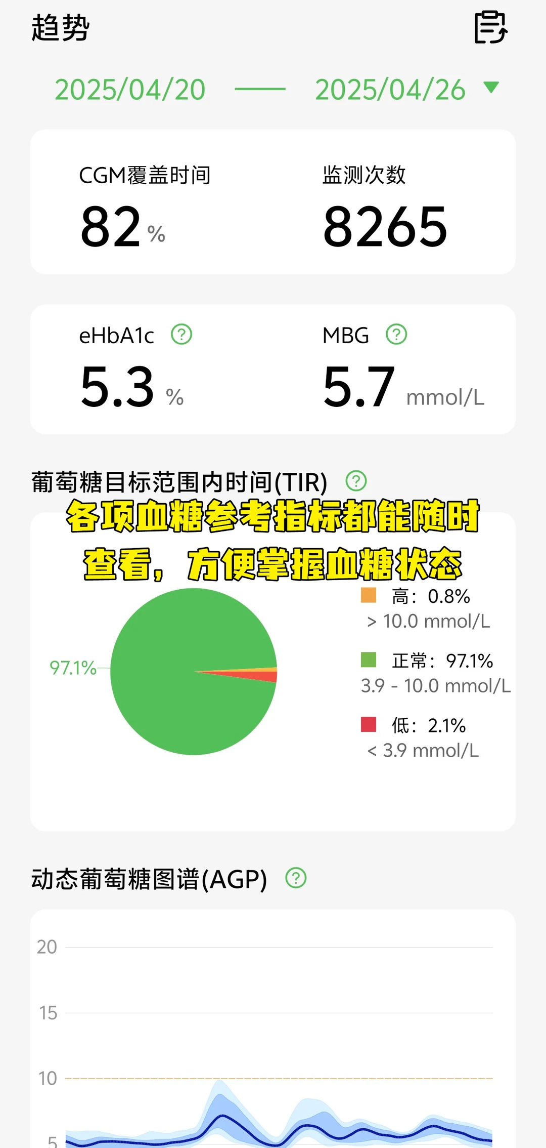 这样连续监测15天,生成21600个血糖值,能够非常荃面地反映出这段时间的血糖波动情况,包括TIR值、预估血红蛋白等专业指标