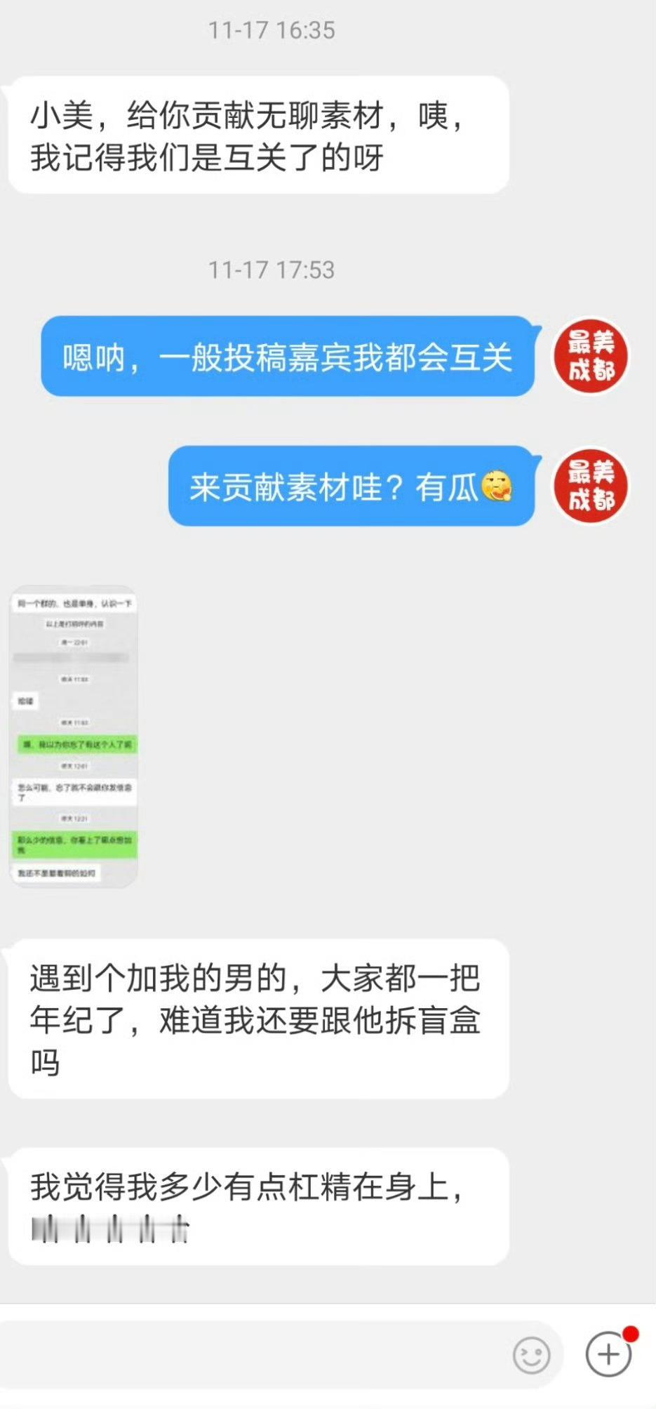 【我说先看下个人资料和照片,男生说先聊 聊得来再给】小美,群里有个男生加我,大家都一把年纪了,难道我还要跟他拆盲盒吗?我也觉得自己多少有点杠精在身上,哈哈!果然单身都是有原因的… 你一般先看资料还是先聊?