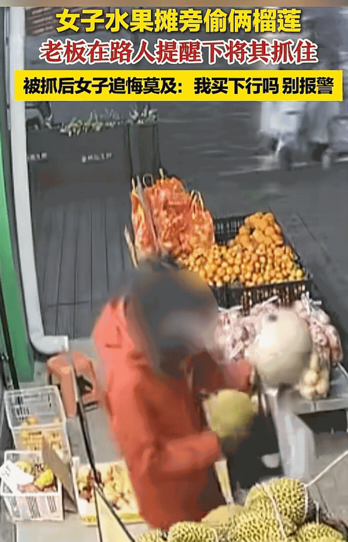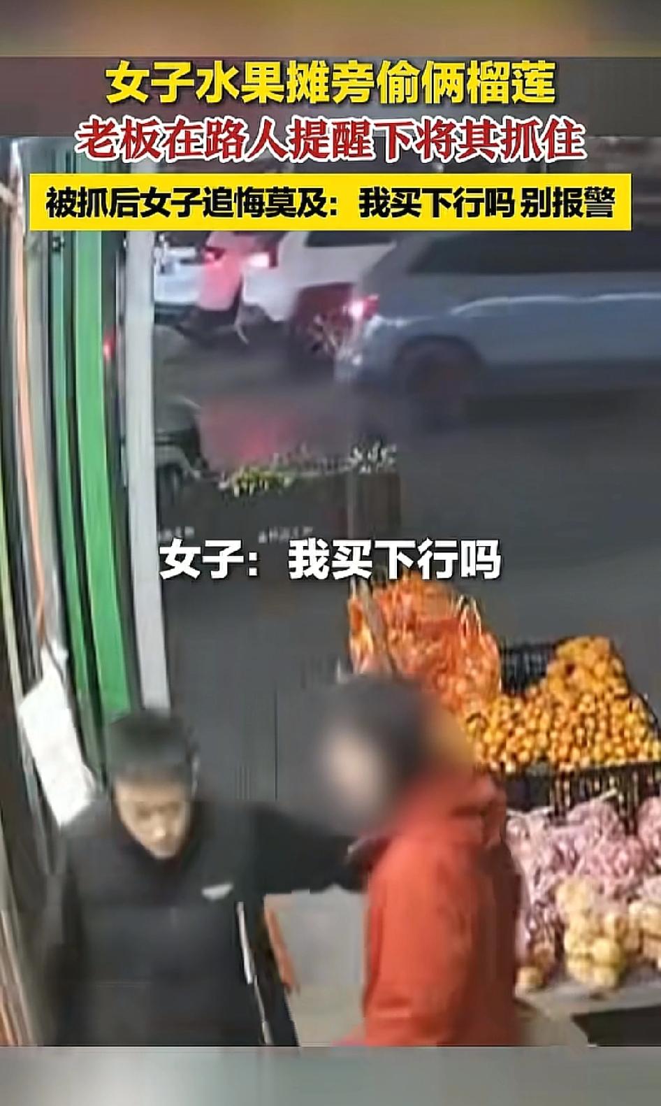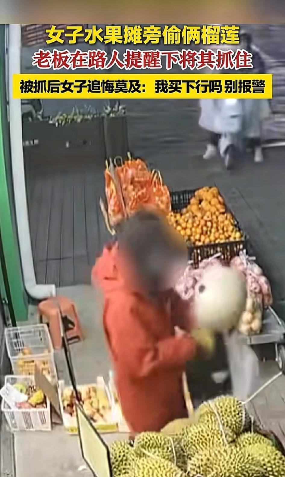 “后悔莫及啊!”河北石家庄,一女子偷水果摊榴莲被抓秒求饶:“我买下别报警”。 不得不说这个女子也太胆大了吧! 路边水果摊,女子以为没有人看到,就趁人不备偷走两个榴莲,令人没想到的是,这一幕被路人看到了,还提醒了老板。当场抓住女生拿回榴莲。 被抓后她慌了神,反复说“我把这俩买下,别报警行吗?” 网友热议, 抓住了她知道害怕了,要是没抓住肯定还有下次,必须报警。 胆子真肥,必须报警,这一个榴莲百来块钱,做生意容易吗? 其实,想要的东西可以靠努力得到,靠偷抢得来的只会是麻烦,千万不要因小失大。 冬日生活打卡季 (信息来源:法治进行时)