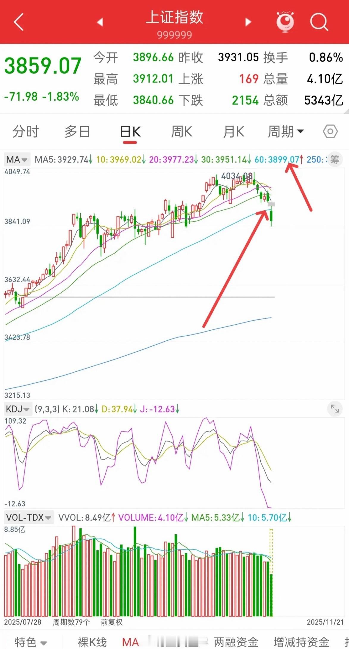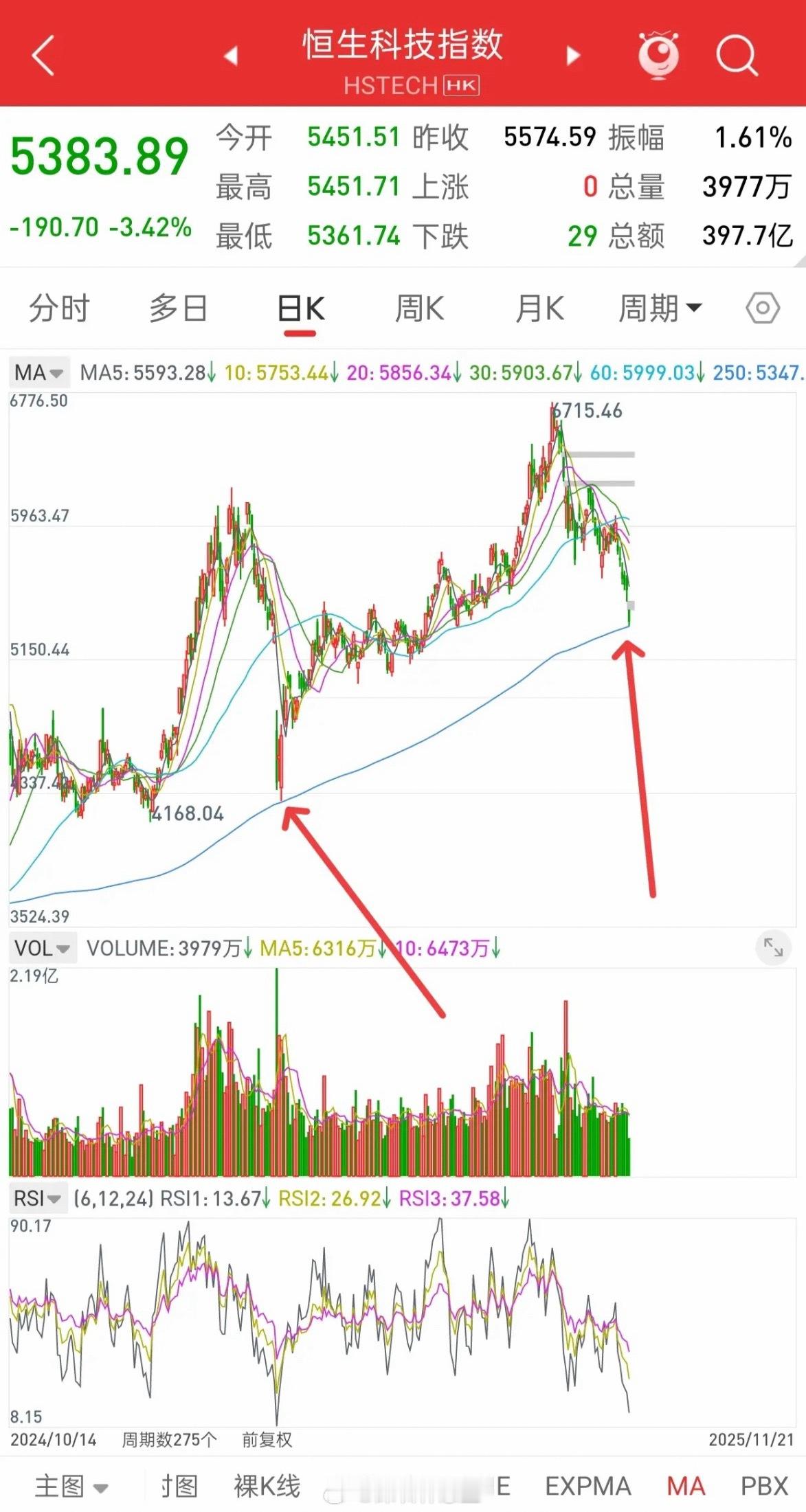 牛市,没有人能抄到最低点,熊市,抄不完的低点!大盘,牛熊拐点在哪,60日均线!(以收盘价为准)大盘,目前上方压力60日均线3900附近,下方支撑五月均线3825。短期可以先参考3825-3900这个区间。今天上午关注最多的还是恒科,恒科目前处于年线5347支撑上方,这里需观察年线能否守住。截止目前放量1900多亿,这里有抄底的,有割肉的。放量下跌一般是见底信号,但是至于是不是底,需有待观察。抄底最好的方式,是关键支撑位附近进场,支撑位下方带好防守,比如1-3%的防守,错了,小亏出局,对了,大肉。有些人遇到一次单边下跌行情,前面的努力全部白费,甚至被市场淘汰;而有些人经历十次单边下跌,还在这个市场活跃。严格止盈和止损,以及仓位管理,这句话只有遇到像今日单边下跌时,才显得珍贵。