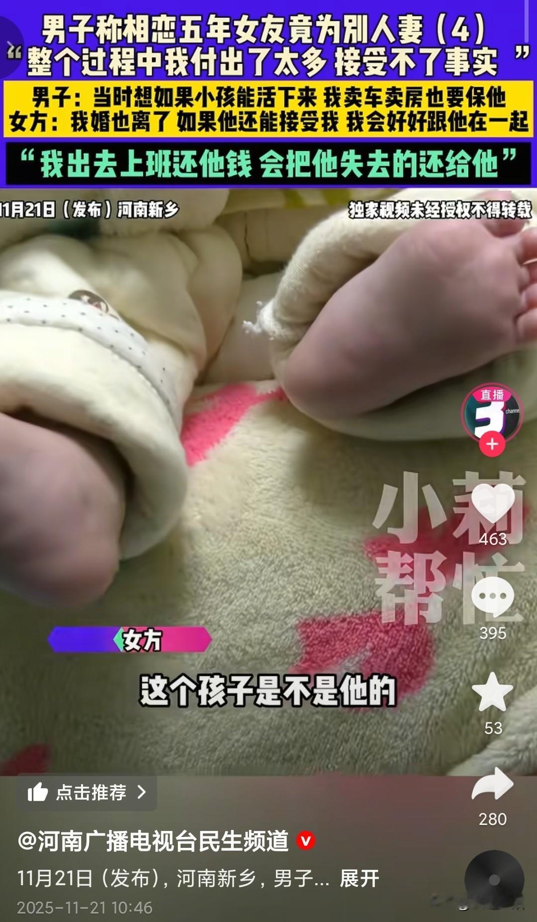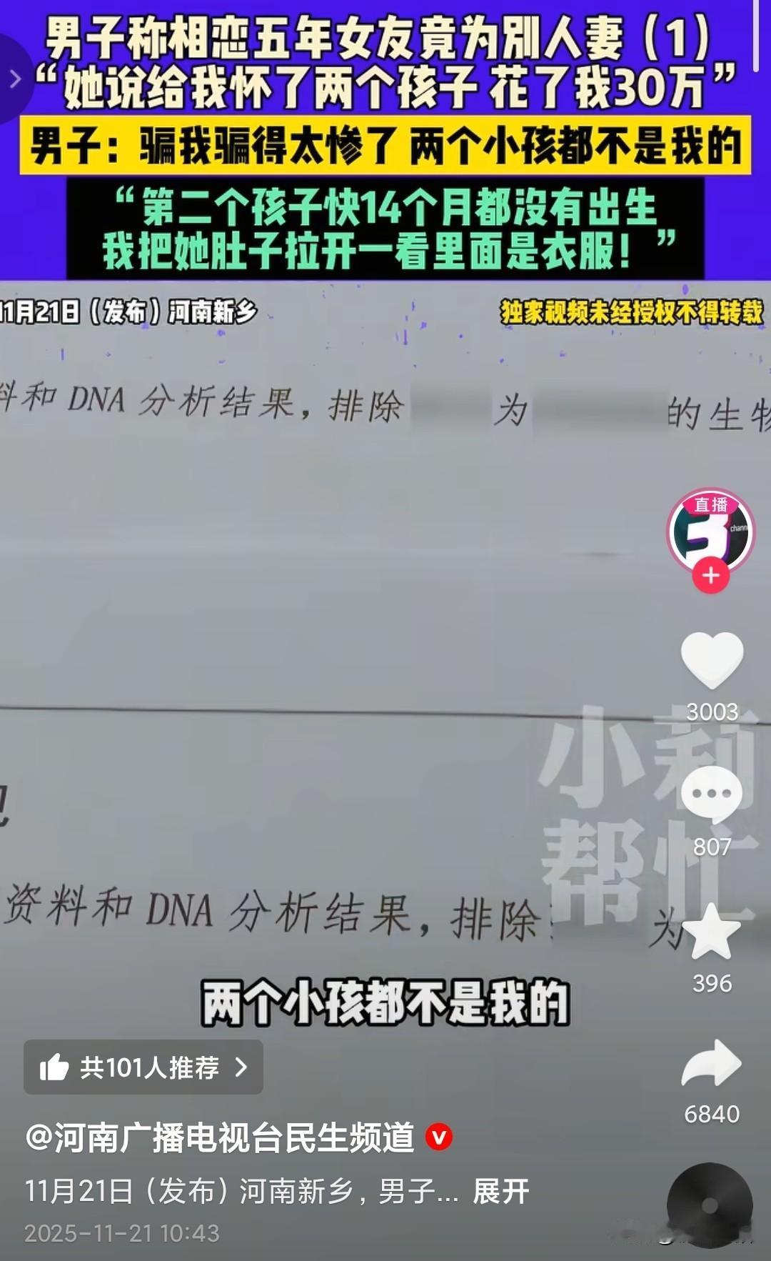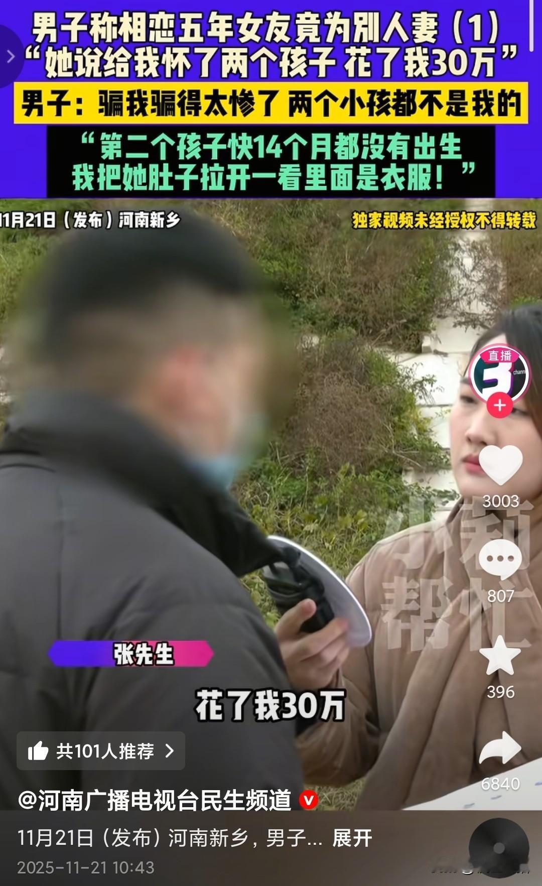 和女友相恋5年,怀了两个孩子,都不是自己的,还给她花了30多万。 他们俩是2020年相识的,但是由于女方家里催婚,就直接和介绍对象闪婚了,但没有告诉男友(张先生)。 在2021年的时候,她撒谎说怀了男友(张先生)的孩子,整个孕期的所有开销,都是张先生在负责,孩子七、八个月的时候说孩子要窒息了,来要钱,张先生提出要去看她的时候,被她拒绝了。 2024年8月又骗张先生说她怀孕了,一直到现在,总共13个月还没有生下来,把她的肚子掀开一看,发现全部都是衣服,此刻她理由都找好了,说孩子八、九个月的时候就不行了,张先生非常难过,两个孩子面都没有见到,钱还花了不少,想到之前种种反常的行为,要她交代其中的事实。 之前还带她回去见了自己的家人,跟张先生的家人说还有几天就要生了,现在钱没了不说,在亲戚面前脸丢掉了。 这女方做的也不地道,自己明明已经结婚了,还不跟男友(张先生)分手,她还对着镜头面前说,“自己没有勇气说出事实”,她的每一步都是为了能够得到张先生的钱,从2021年结婚的时候就开始撒谎,骗了张先生,张先生的父母,连自己家人都骗。 警察去了她家里才了解到情况,2021年她已经结婚了,有两个小孩,B超都是她p的图,为了骗钱,最后做了亲子鉴定,不是张先生的。 结婚了还和张先生(男友)保持不正当的男女关系,最基本的道德底线都没有,对得起她现在的老公吗?邻居、父母又是怎么看她的,一点脸都不要了。 现在女方自己离婚了,又想和张先生结婚,但两个孩子都不是张先生的,从头到尾把他耍的团团转,是个男的他都接受不了。 张先生每月工资2万只给自己留个生活费,其他的全给她,现在人家要回自己对女方的所有开销也是合情合理,女方答应他说自己工作慢慢还,何必呢,赌上了自己的声誉,辜负了别人的感情,破坏了自己的家庭。 张先生也是,第一个孩子出生了也不过去看一下,现在钱被花完了,大概率还不了多少,是他太重感情,还是对方有手段、会哄人。