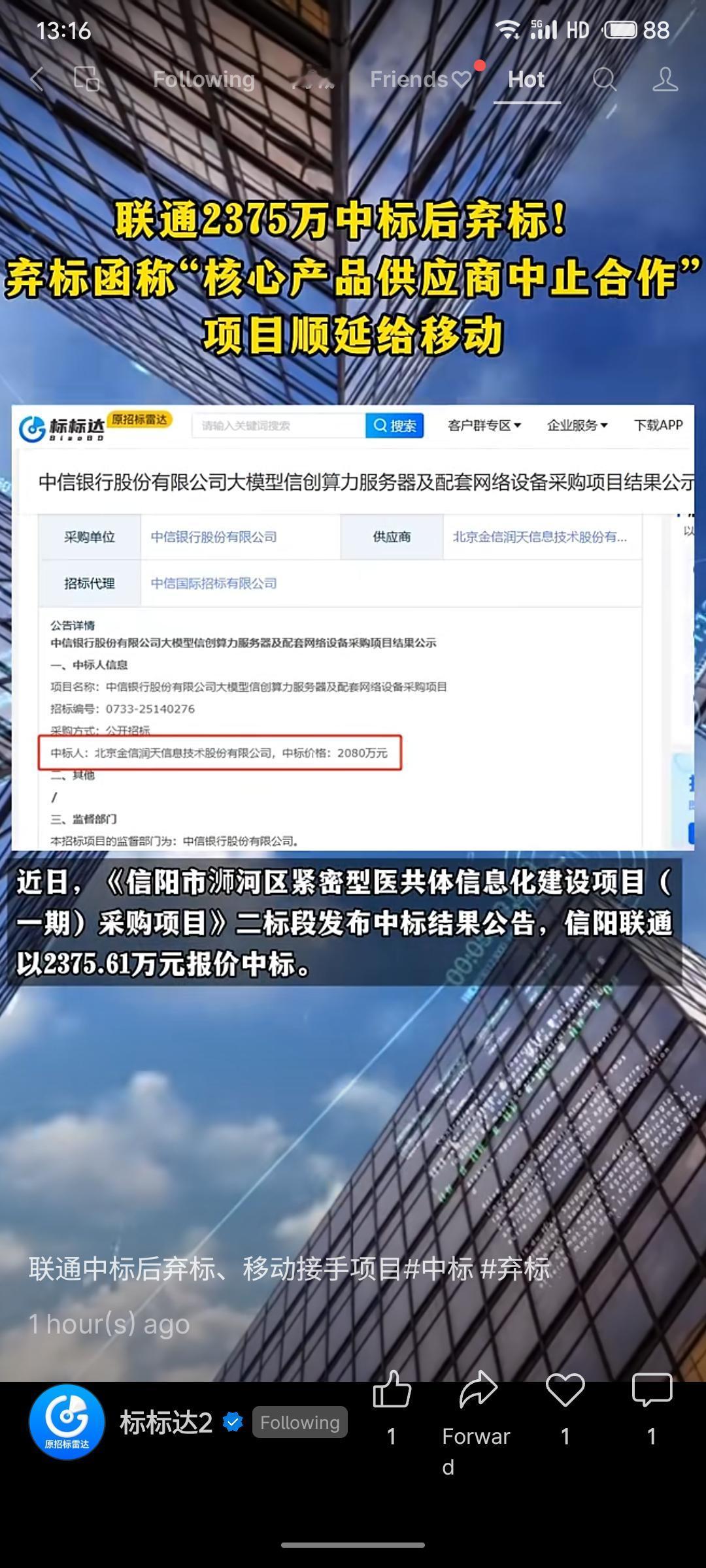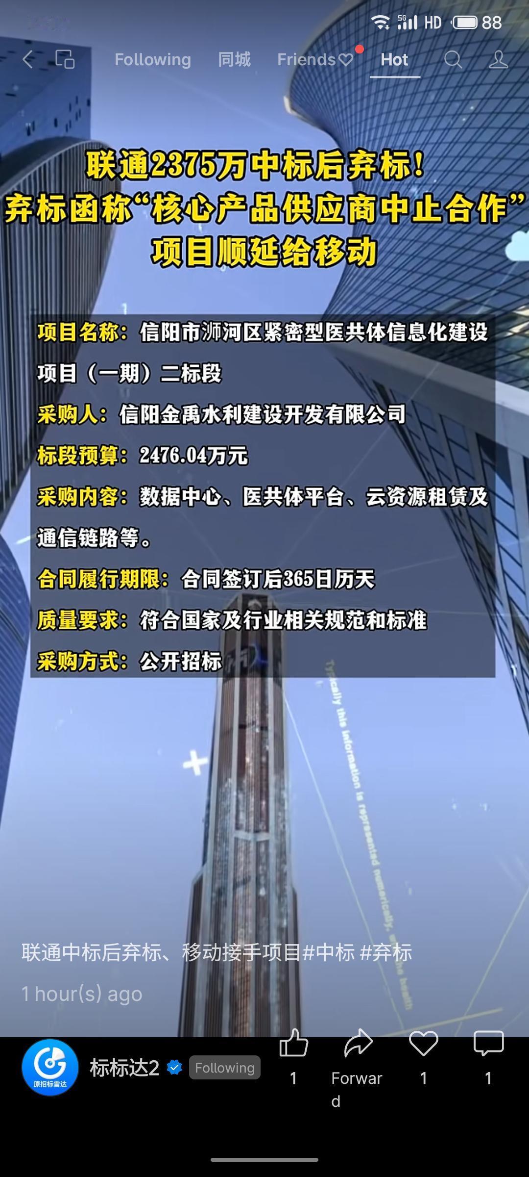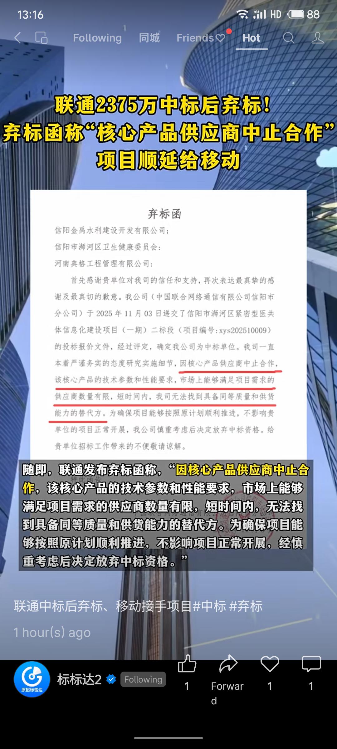 中国联通以2375万元中标信阳市医共体信息化建设项目后,因核心产品供应商突然中止合作,无法及时找到合格替代方,为确保项目顺利推进,主动放弃中标资格。该项目最终顺延给中国移动接手。