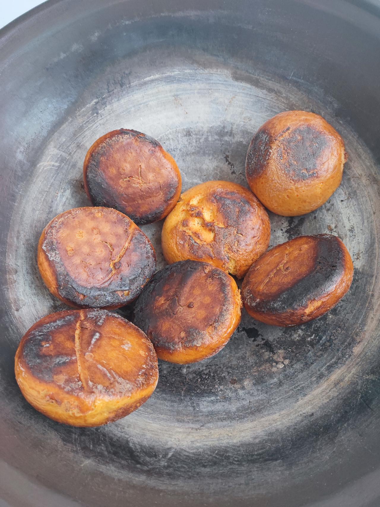 太多的时候结果和你想的…… 原来都是蒸小小的馒头, 今天图省事, 来锅大个的馒头, 掀开锅盖还满满的成就感, 胖乎乎的散发着面香, 美滋滋喊老公来品尝, 尴尬了,[黑线] 不熟。 本想再放锅里蒸一蒸, 锅里的水都被我舀出去了, 柴火锅散发着火炉子一样的热, 索性把不熟的馒头放锅里熏吧, 反正就老公我俩, 也不嫌弃啥样,[黑线] 于是乎我的馒头就变身了。[笑哭] 这算是烤馒头吗?[捂脸]
