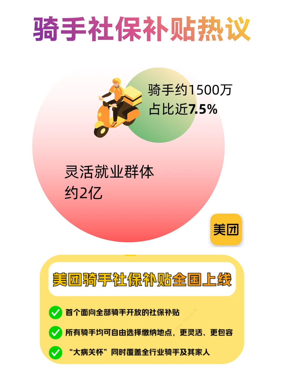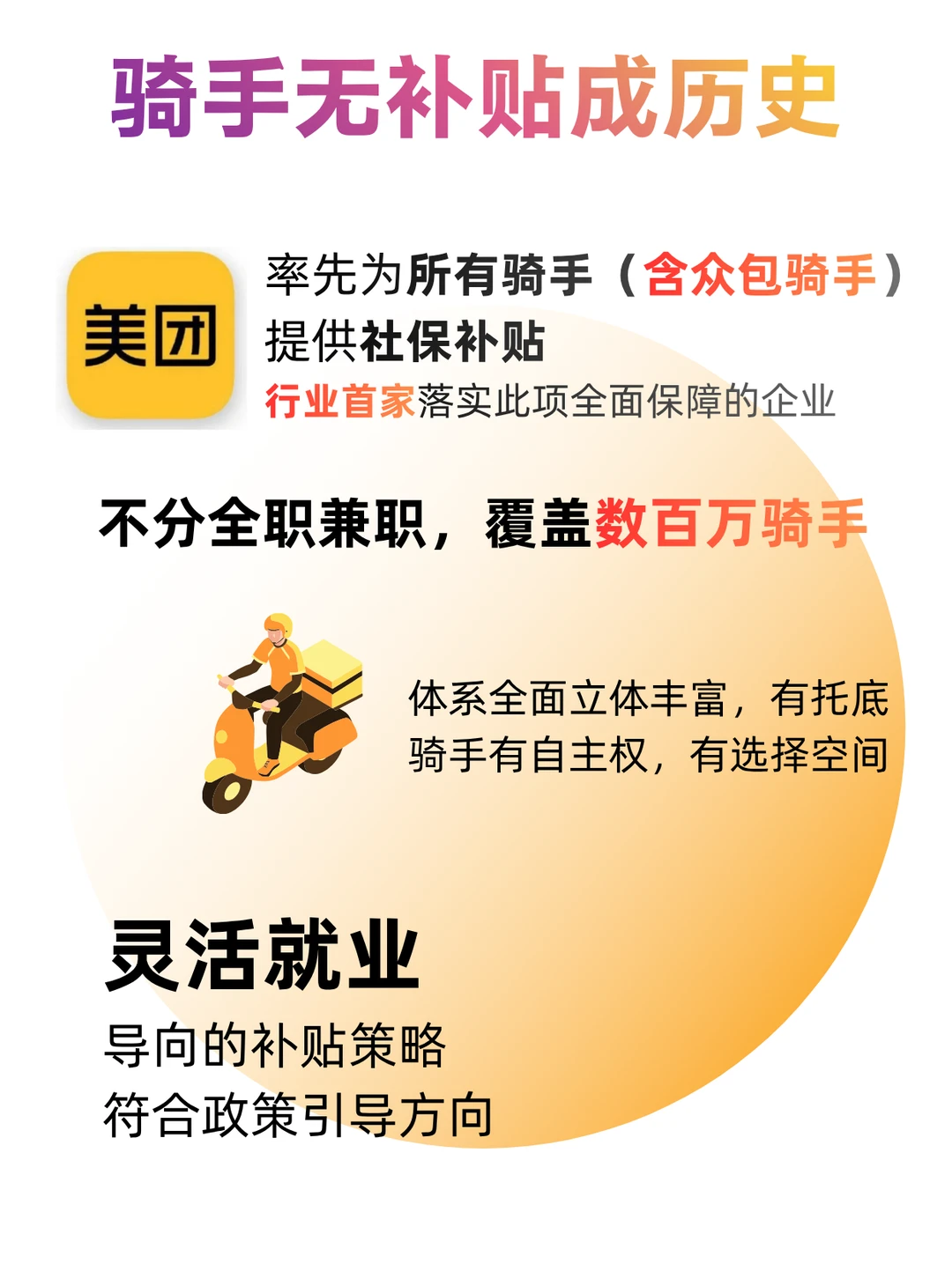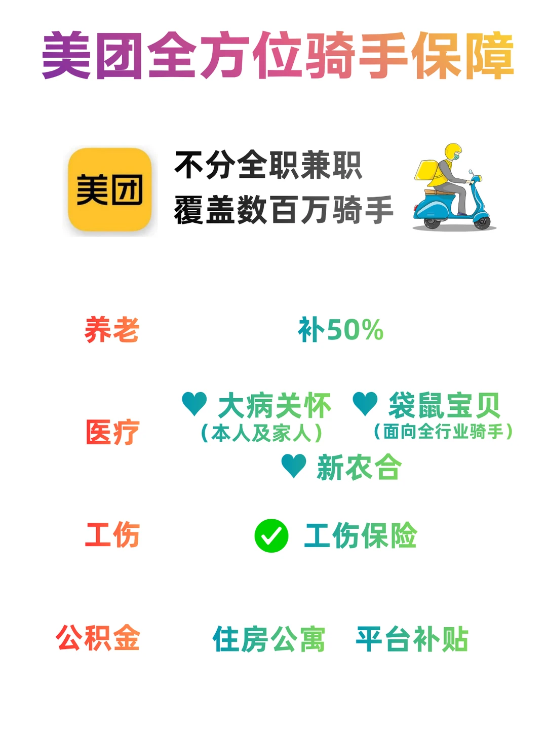 美团最近挺勇的,要为所有骑手提供社保补贴,这应该是行业首家落实全面保障的企业,关键是不分全职兼职,众包骑手也能有社保补贴,估计能覆盖数百万骑手,这件事办的还是很良心的。仔细扒了一扒,养老保险、工伤险、意外险等骑手最需要的保险都覆盖了,真金白银投入。