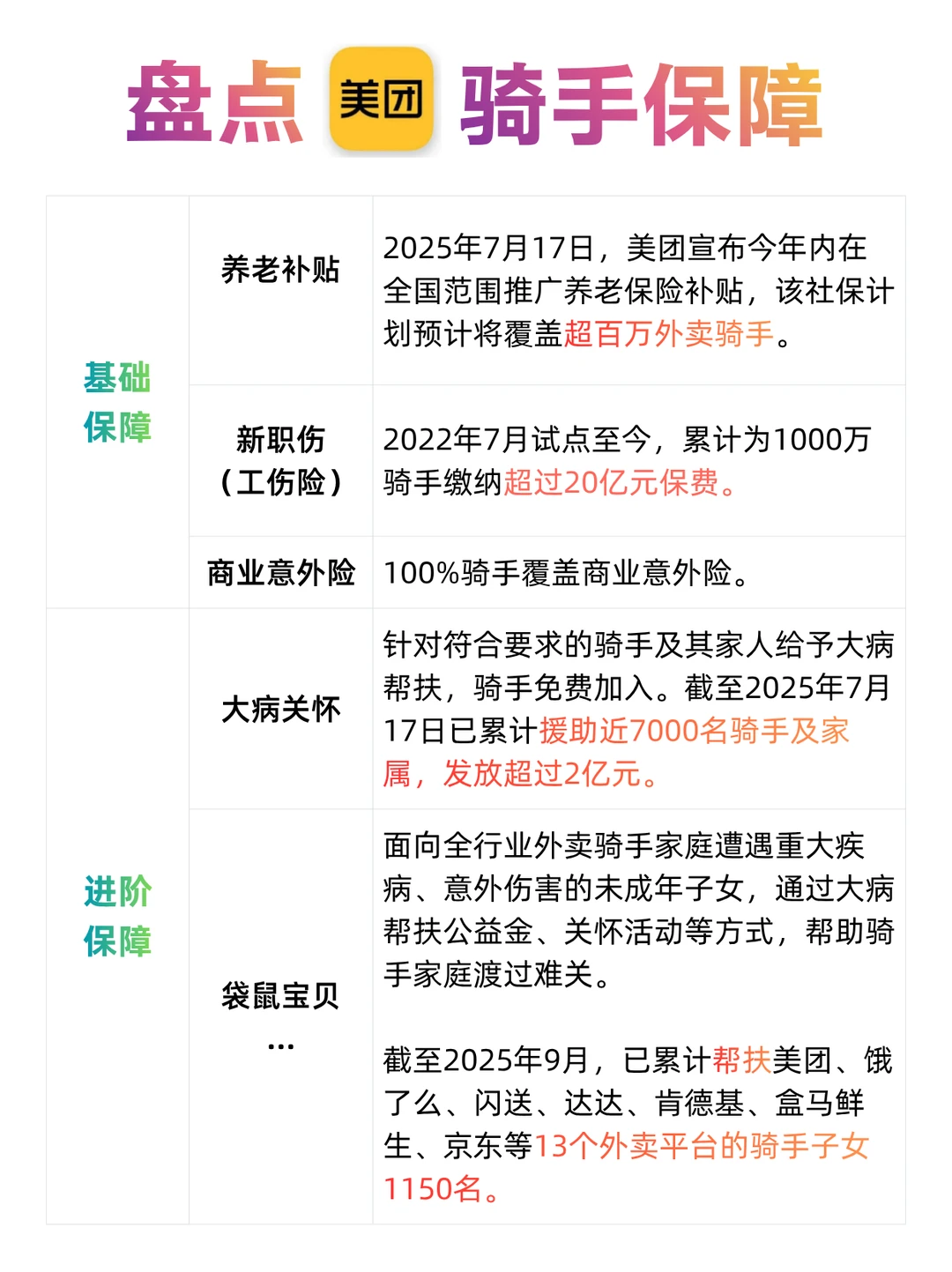 其实美团还是做了很多实事,他家的新职伤(工伤险)从试点至今,已累计为1000万骑手缴纳超过20亿元保费,大病关怀保障也已累计援助近7000名骑手及家属,发放超过关怀金2亿元,积极解决民生问题的企业值得被看到,特别是这两年大环境有些挑战,挺住压力做实事,值得被看见。