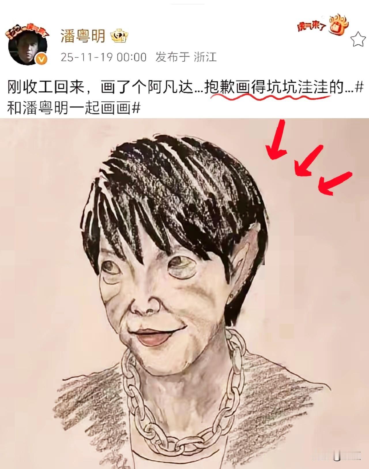 潘粤明发了幅画,网上炸了。 画里是个“丑鬼” 没有文案、没有解释,就一幅“丑鬼”画像静静挂在社交平台,短短几小时点赞狂飙50万+ ,评论区刷爆“懂的都懂”“太解气了”“这波直接封神”!全网心照不宣——这是他暗戳戳回怼辱华品牌,不喊空洞口号、不搞刻意炒作,一支画笔,就是最硬的态度,比千言万语都有力量。 反观如今的内娱,“遇事装死”早就成了常态,甚至成了很多艺人的“生存法则”。多少人把“明哲保身”刻进DNA,哪怕事关民族底线、事关国人尊严,也忙着隐身避祸、沉默不语,生怕得罪人、丢资源,把“沉默是金”扭曲成“躺平保命”,看得网友满心膈应。 可潘粤明偏要做那个“逆行者”!这从来不是他第一次“用笔发声”:此前绘“不肖子孙”图亮明立场,短时间狂揽1.5万点赞、3000+转发,字字未提却态度鲜明;“熊猫杯事件”时,他不惧争议公开怒斥不当行径;2025年相关立场表态,24小时斩获28万赞,从不靠沉默换“安稳”,更不拿立场换资源。 而且别以为他只是“玩票画画”,实力早就被专业盖章认证:代表作《迷彩熊猫》被洛克菲勒艺术基金收藏,多次入选国内当代艺术展,笔锋里的正气与风骨,根本藏不住。 50万点赞,从来不是冲画作本身,而是网友对“敢说敢做”的狂欢,是对“坚守底线”的强烈共鸣!在流量至上、人人忙着迎合讨好的内娱,太多艺人丢了风骨、没了立场,唯流量是从、唯利益是图,而潘粤明用一支画笔,守住了初心,也赢尽了人心。 内娱从来不缺流量艺人,缺的是潘粤明这样“有态度、有风骨、有底线”的清醒者!不趋炎附势、不妥协退让、不随波逐流,这样敢作敢为、坚守本心的艺人,活该被全网偏爱,活该火一辈子!