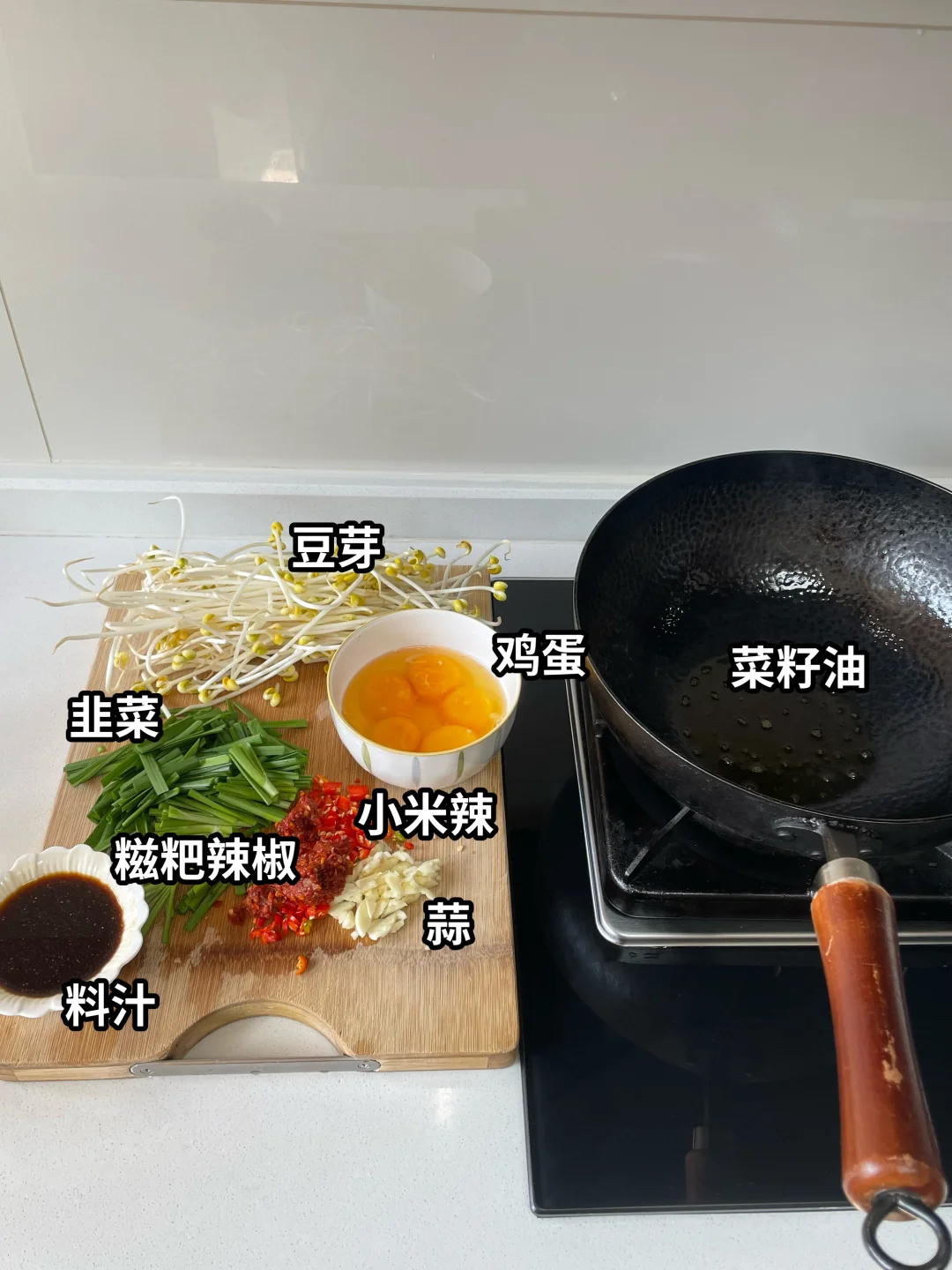 姐妹们,老样子,今天依旧给大家出一个巨下饭的菜,豆芽炒鸡蛋,这样做出来的豆芽炒鸡蛋,豆芽脆爽鸡蛋顺滑,再加上韭菜的香气和糍粑辣椒的香气,真的巨下饭。喜欢的姐妹可以尝试做一下。