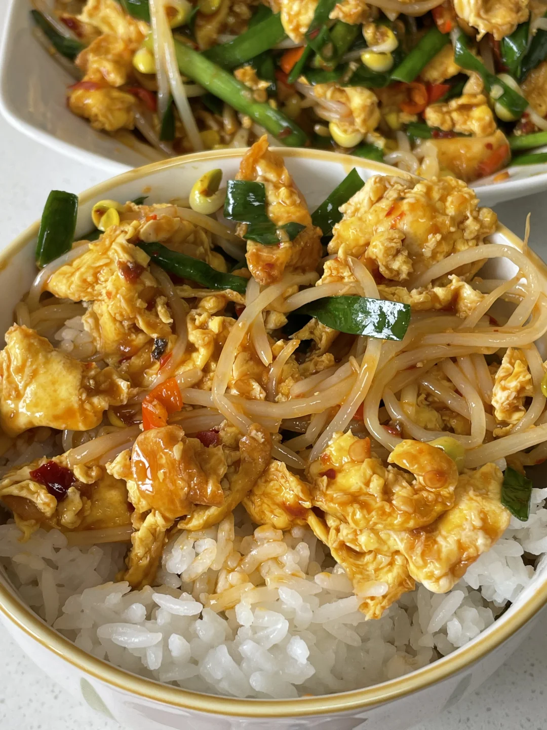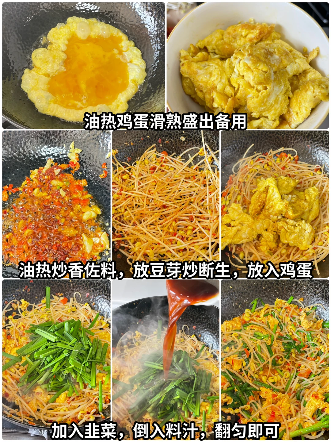 3⃣️起锅烧油,油热将鸡蛋滑熟盛出。再放入油,油热炒香小米辣、蒜、糍粑辣椒,放入豆芽炒断生,加入鸡蛋,加入韭菜,再倒入料汁翻匀即可。这样炒出来的鸡蛋豆芽真的巨下饭,喜欢姐妹试试吧