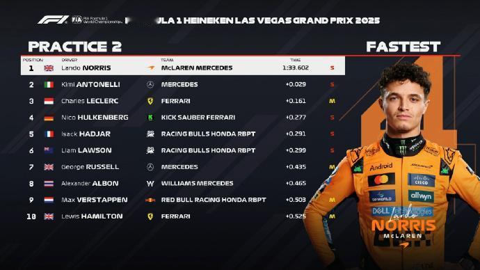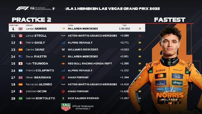 赛车:2025F1拉斯维加斯大奖赛二练成绩 二练因红旗提前结束,一些车手没有来得及做出软胎成绩。最终诺里斯以1:33.602的成绩拿下第一,安东内利第二,勒克莱尔的中性胎成绩排在第三。 比赛时间(北京时间) 11月22日 三练 08:30 / 排位赛 12:00 11月23日 正赛 12:00