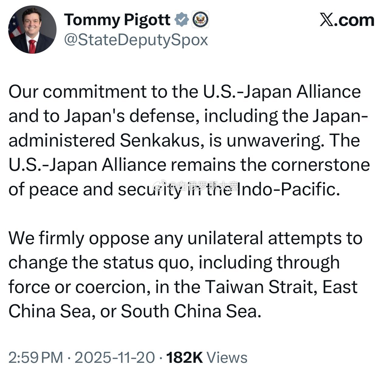 11月21日,美国国务院副发言人皮戈特(Tommy Pigott)在X上发贴称:“美国对美日同盟和日本防卫的承诺坚定不移,包括钓鱼岛。美日同盟仍然是印太地区和平与安全的基石。美国坚决反对任何单方面改变台湾海峡、东海或南海现状的企图,包括使用武力或胁迫手段”。