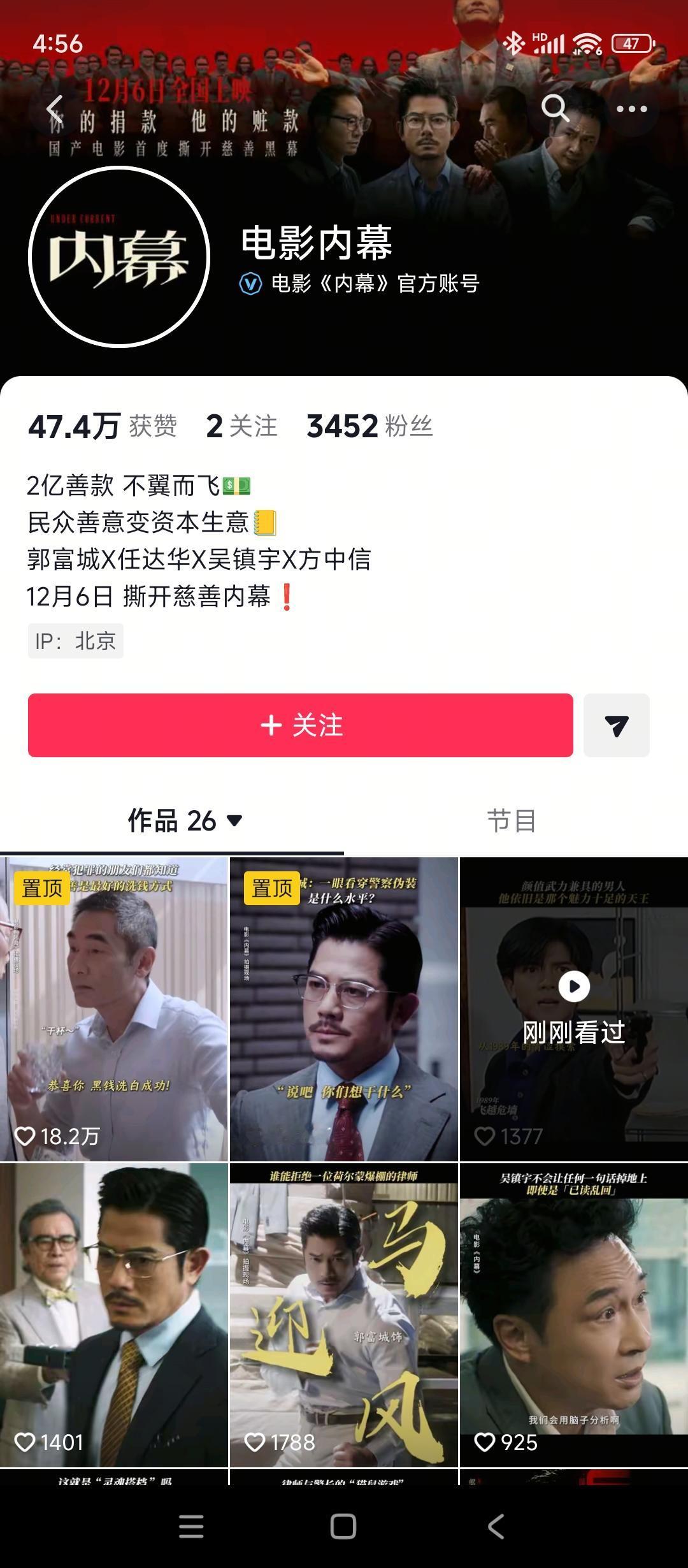 郭富城最新电影《内幕》 看着目前抖音的热度,真的很差,官方发了十几个短视频,粉丝只有3000多人 猫眼上的关注度也不够 热度不够啊 加油 超过上次《无名指》50万票房