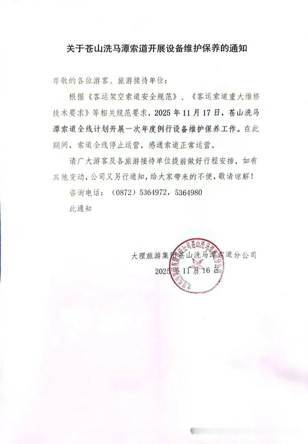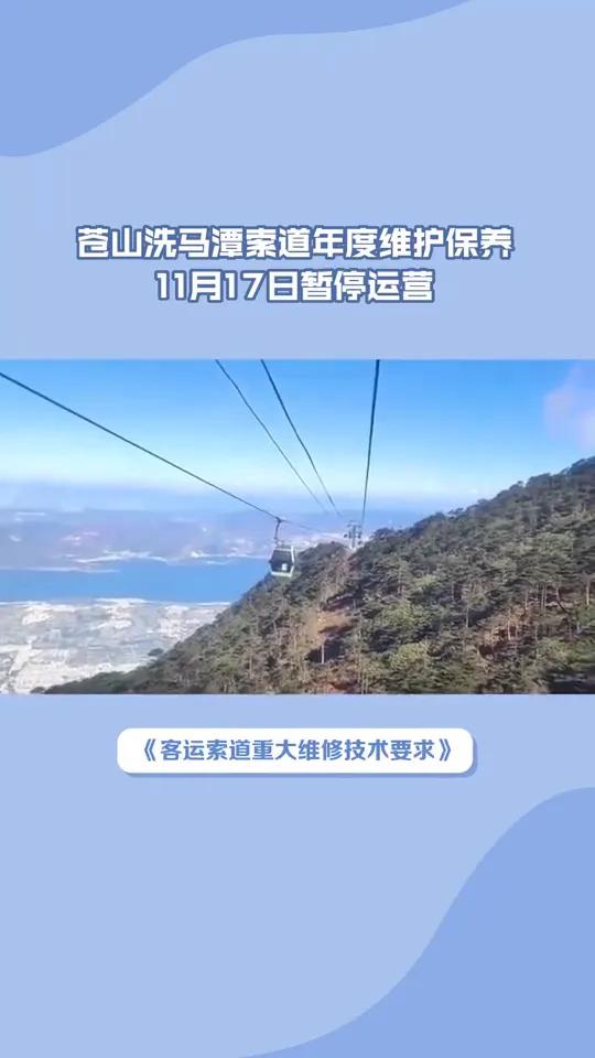 苍山洗马潭索道将进行年度维护保养,11月17日暂停运营。 别白跑一趟!11月17日大理苍山洗马潭索道停运,这是一则关于苍山洗马潭索道开展设备维护保养的通知。尊敬的各位游客、旅游接待单位:依据《客运架空索道安全规范》、《客运索道重大维修技术要求》等相关规范要求,2025年11月17日苍山洗马潭索道全线计划开展一次年度例行设备维护保养工作。 在此期间,索道全线停止运营,感通索道正常运营。请广大游客及各旅游接待单位提前做好行程规划,若有其他变动公司将另行通知,给大家带来的不便,敬请谅解。 大理苍山洗马潭索道