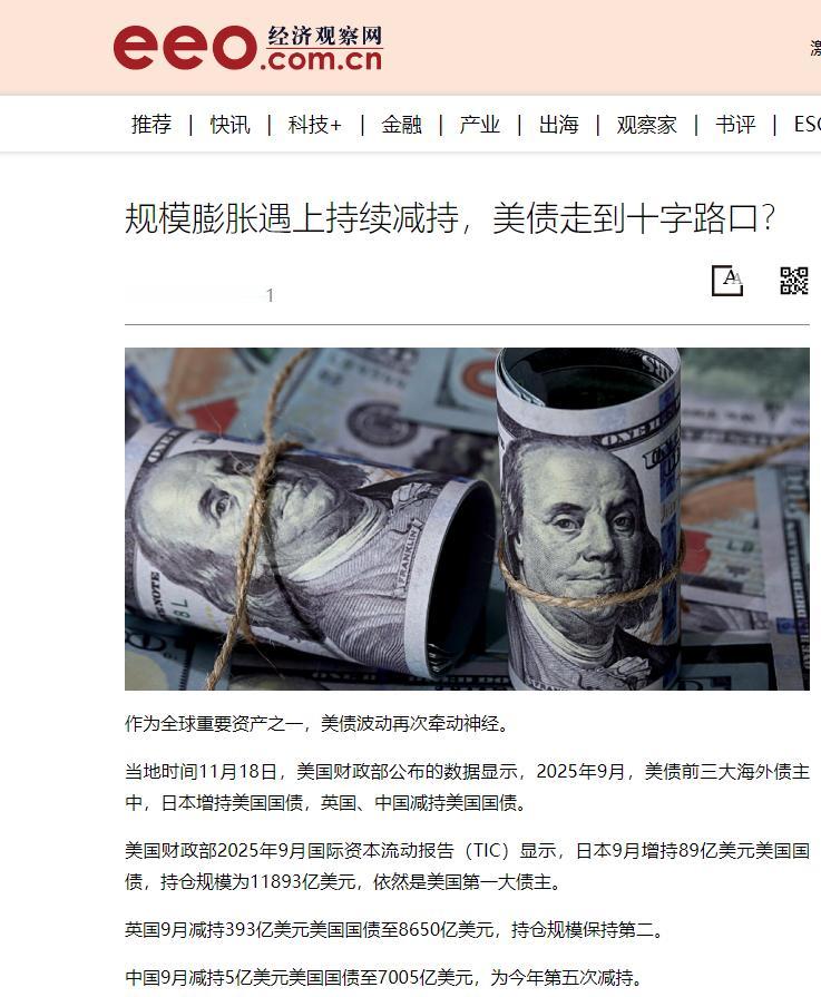 中国抛售美债!当地时间11月18日,美国财政部公布最新数据显示,在2025年9月,美债前三大海外债主中,日本增持美国国债,而中国、英国进行了减持。   2025年,美国的总债务就往上蹿了2.17万亿美元,堆到了37.64万亿美元的高位,这个数字比美国全年的经济总量还高,债务占GDP的比重早超了120%。   更让人没底的是,现在美国政府的开支里,还债务利息居然是第二大头,比教育、医疗这些老百姓最需要的民生花销都高。   连美国参议员自己都承认撑不了多久,三大评级机构更是直接把美国的信用评级从最高级往下调了,曾经的“无风险资产”神话早破了。   咱们国家可不是一时兴起才减持的,早年间也吃过盲目持有的亏。2013年那会儿,大伙儿都觉得美元是“硬通货”,咱们手里的美债最多冲到1.3万亿美元。   结果呢?美国后来一次次开印钞机搞量化宽松,硬生生把咱们手里美债的价值稀释了一大截。   真正让咱们彻底警醒的是2022年,美国把金融当成说翻脸就翻脸的武器,说冻结俄罗斯几千亿美元海外资产就冻结。   这一下就让全世界看明白了:把太多外汇绑在美债上,就等于把钱袋子的钥匙拱手让人,人家想锁就锁。   从那以后,咱们就开始有计划地减持,2022年一年就抛了1732亿美元,2023年、2024年也没停过,这根本不是跟美国置气,而是把外汇安全真正放到了第一位。   有人可能会问,同样是美债大债主,日本咋还在买?他们经济太依赖出口,日元汇率一跌就慌神,只能靠买美债来稳住本币,属于没办法的办法。   但咱们中国不一样,作为世界第二大经济体,咱们有完整的工业体系,有庞大的国内市场,根本不用靠绑定美债过日子。   现在咱们的思路特别明确:鸡蛋绝不能都放在一个篮子里。抛掉一部分美债腾出来的钱,都转投到了更安全的地方,黄金就是重要选项。   央行已经连续12个月增持黄金了,到10月末黄金储备飙到7409万盎司,占外汇储备的比重升到8.89%,创下历史新高。   这东西从古到今都是硬通货,不管美元欧元怎么折腾,黄金的价值都稳得住,难怪现在全球央行都在囤黄金,它早成了各国储备的第二大资产,这才是咱们外汇储备的“压舱石”。   除了买黄金保值,咱们还有更长远的打算,让人民币在国际上说话更有分量。   以前咱们买沙特的石油、跟巴西做贸易,都得先把人民币换成美元,多一道手续不说,还得看美国脸色。   现在完全不一样了,跟沙特谈石油生意,直接递人民币就行;和巴西做大豆买卖,双方本币一划转就搞定。   上个月的最新数据显示,人民币在全球支付中的占比又涨了,虽然离美元还有距离,但架不住咱们步步稳扎。   咱们手里的美元资产少了,其他国家跟咱们做生意时,用人民币结算的需求自然就多了,慢慢的美元霸权就被一点点削弱,咱们的金融安全也就更有保障。   当然,咱们也不会一下子把美债全抛了,那样既不现实也没必要。   现在7005亿美元的持仓,既能保持一定的国际支付能力,又能在中美经济博弈中留有余地。   反观美国,现在最大的麻烦是新发行的国债越来越没人接盘。   咱们这些老债主慢慢减持,他们就只能靠提高利息吸引买家,这又会加重债务负担,形成越借越贵、越贵越难借的恶性循环。