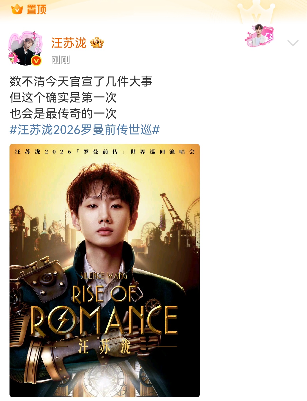 新的期待就此展开✨在罗曼宇宙里迎来了前传 是世巡啊全体起立😭汪苏泷要把罗曼城的浪漫开到更大的世界了! 2026「罗曼前传」世界巡回演唱会重磅官宣!你!中国澳门、纽约、西雅图、墨尔本、新加坡,新的内容新的惊喜,开始期待 2026 !!!