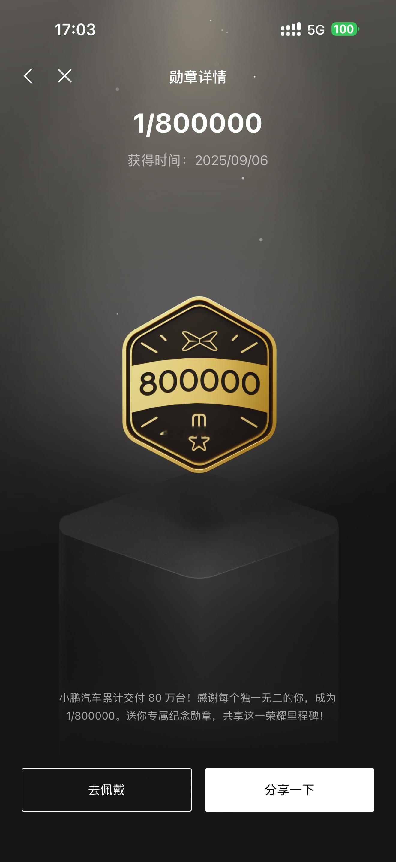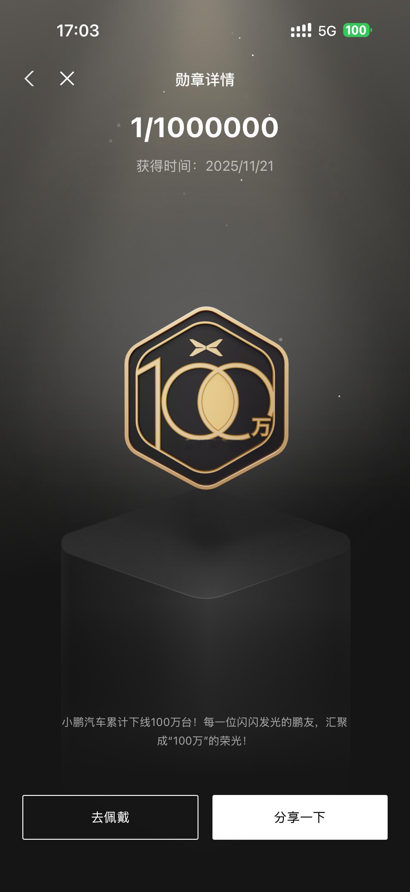2022/6/21 ,20万分之一车主!(小鹏G3)2025/9/6 ,80万分之一车主!(小鹏G6)2025/11/21 ,100万分之一车主!(小鹏P7 Next)我也算是百万分之三车主了!