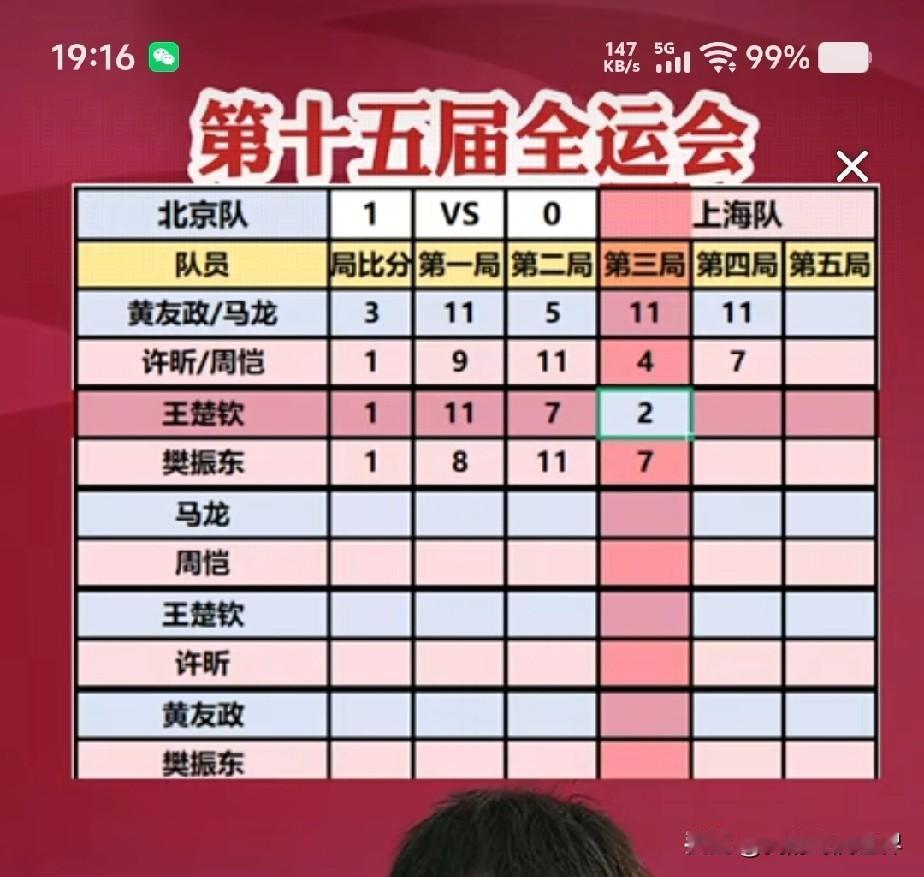 许昕、周凯单打能不能帮小胖凑一分全看你们两个表现了,第一场双打上海输给北京队,第二场小胖目前2:1领先王楚钦,大概率会拿下第二场,这次全运会团体能不能拿下冠军关键还得看你们两个了,许昕和周凯两场单打争取拿下一分就行,拿出120%的状态争取拿下一分,许昕周凯雄起来。