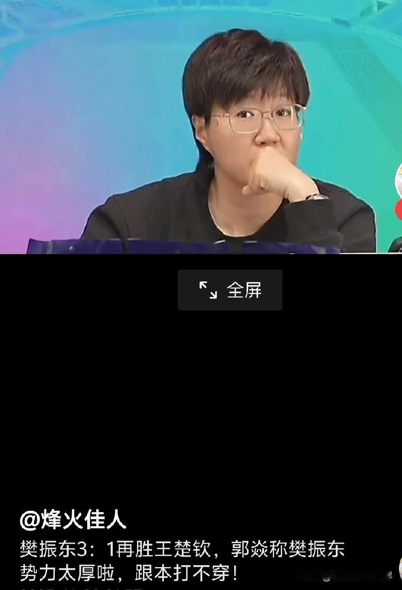 郭焱在直播樊振东和王楚钦团体单打比赛时,称赞樊振东的实力太厚了,王楚钦根本打不穿