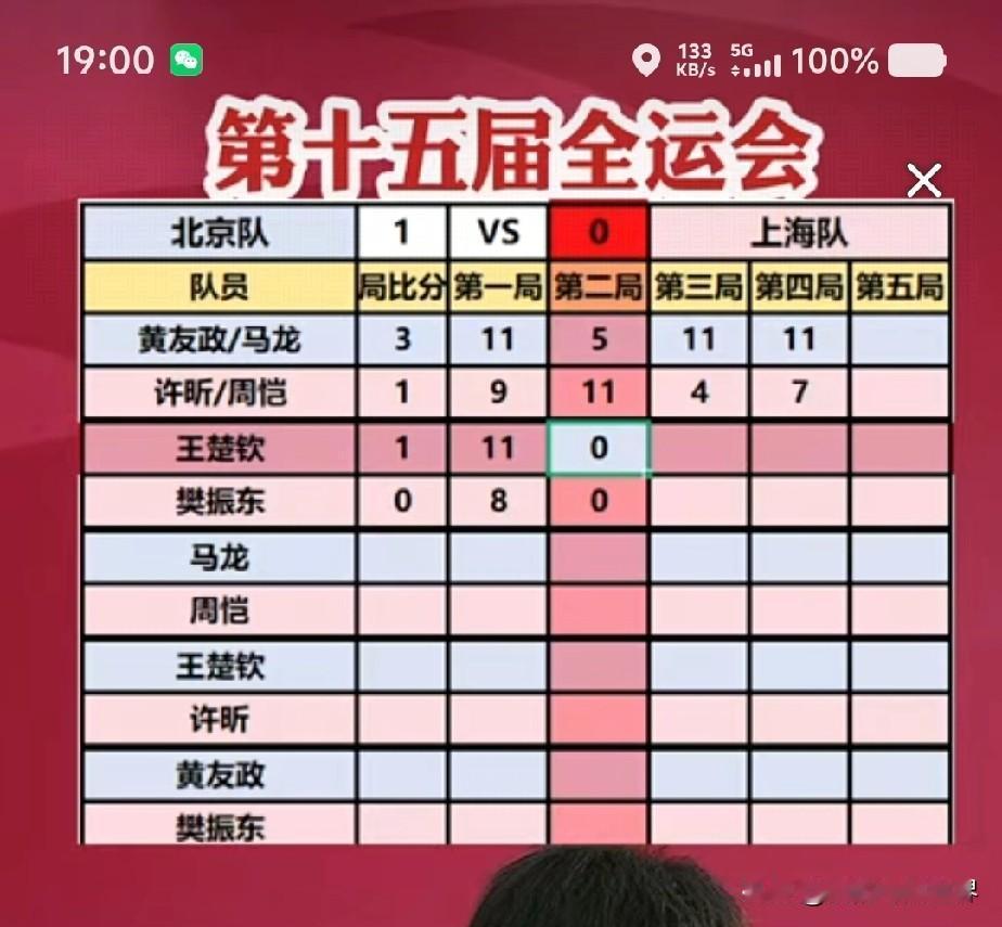 我的天上海队对阵北京队,第一场双打上海队就输了,第一场双打是决定两队谁能拿团体冠军的走向,第一场输了上海队就被动了,第二场上来樊振东8:11输掉第一局,目前局势紧迫,就看小胖接下来能不能稳住大局,上海队能不能得冠,关键还得靠他救场,不过北京队对这枚团体金牌同样渴望已久,也会拼劲全力拿下这枚金牌。