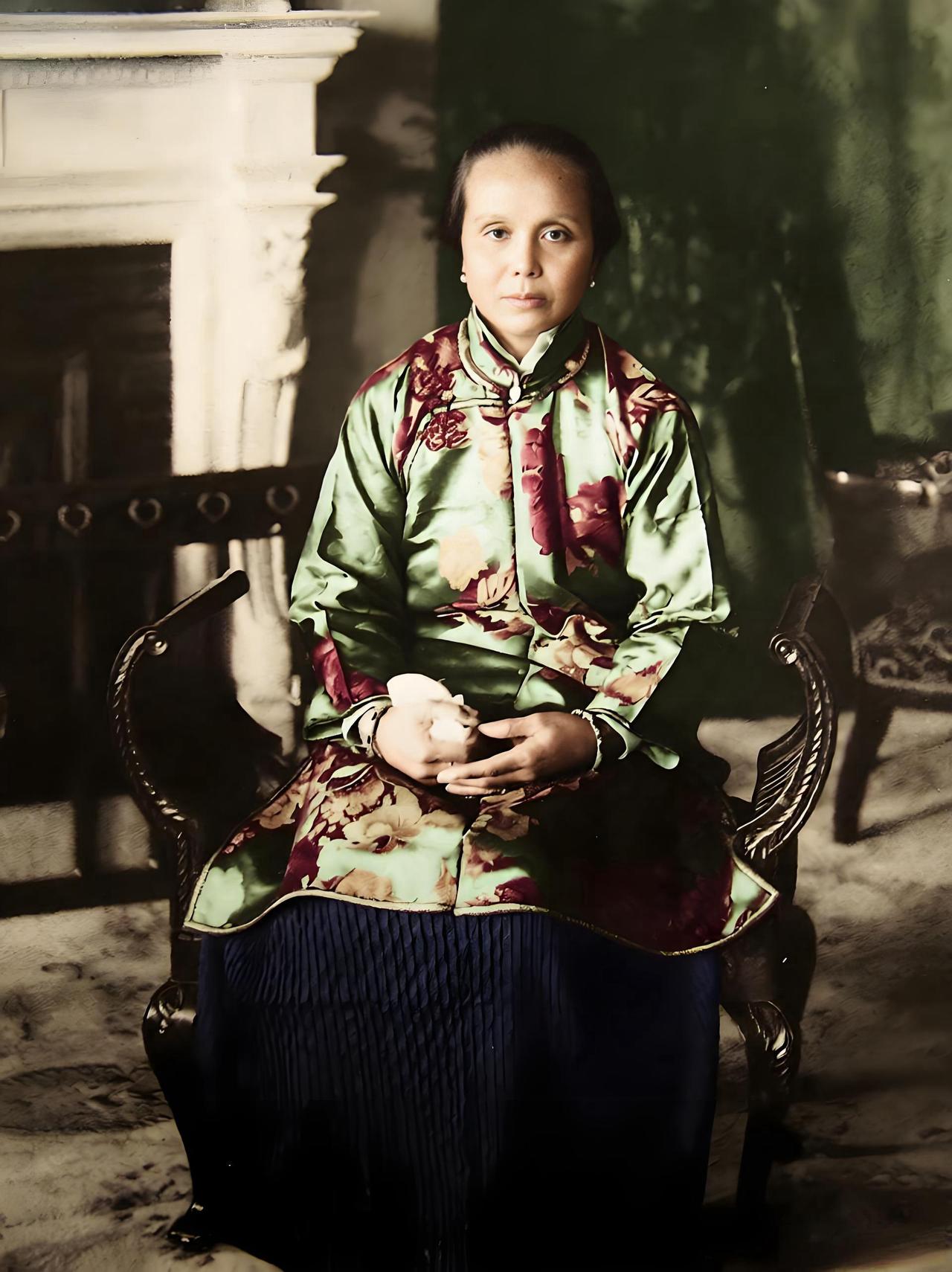 这张照片中的人物是卢慕贞,她是中国民主革命先行者孙中山的原配夫人。 画面中,卢慕贞身着传统中式绸缎服饰,她面容端庄,双手交握,端坐于装饰精美的椅子上,背景可见西式壁炉,体现出民国初期中西文化交融的生活场景。 卢慕贞于1885年与孙中山结婚,育有子女孙科、孙娫、孙婉。尽管她受传统礼教影响较深,与孙中山在思想观念上存在差异,但始终以孙中山夫人的身份默默支持其革命事业,后两人协议离婚,她仍受到社会的尊重。
