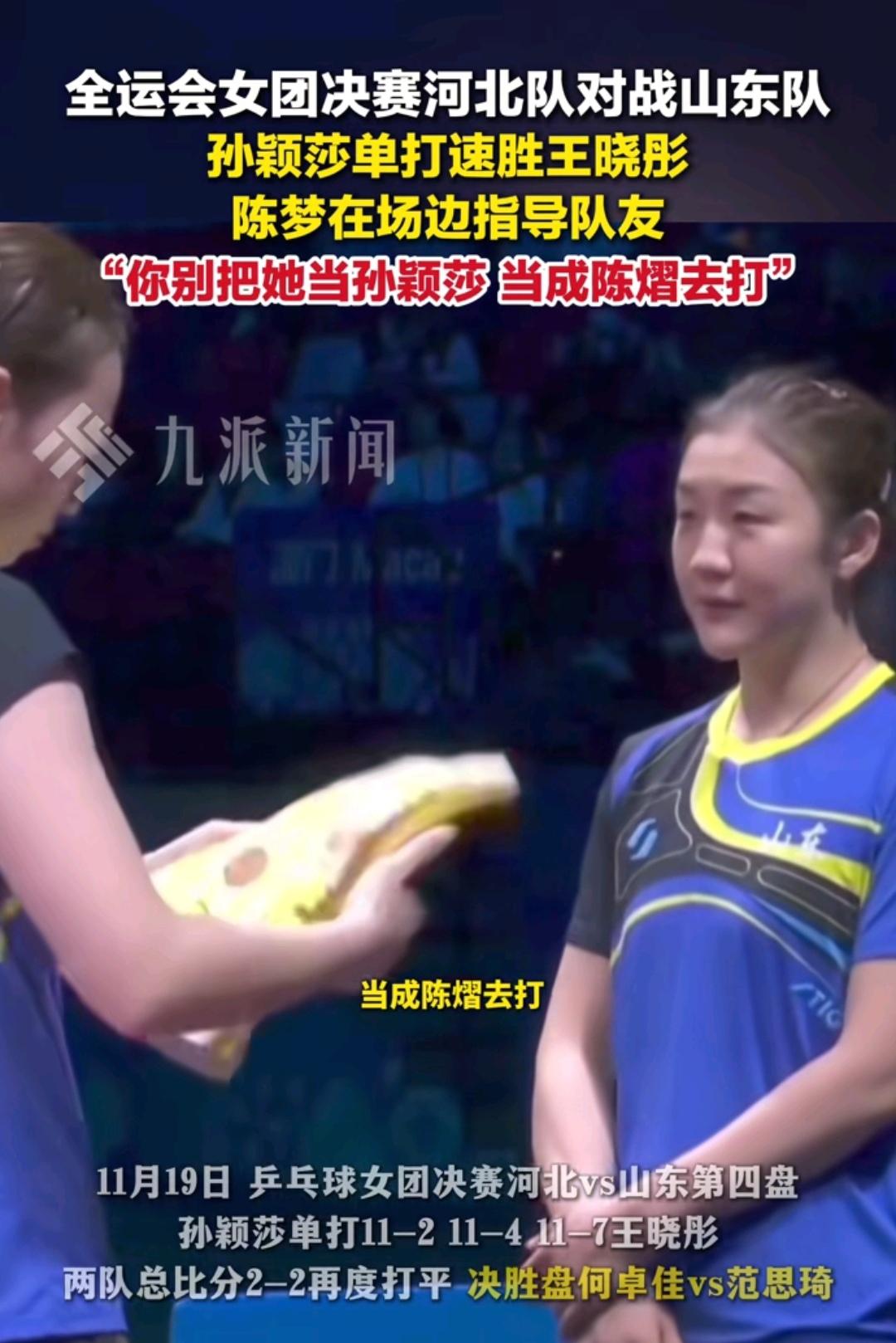 战术指导还得学习陈梦的,乒乓球女团决赛山东队对阵河北队,三单王晓彤对阵孙颖莎。 王晓彤前几天在女单比赛中刚刚1:4不敌孙颖莎,才过去几天时间,陈梦知道王晓彤内心肯定怯这场比赛,毕竟实力本来就不对等。 赛前陈梦是这样给王晓彤做内心疏导的,陈梦说,你不要当她是孙颖莎,你当她是陈熠,因为王晓彤在女团半决赛中3:2战胜了陈熠,梦姐果然与众不同,不知道陈熠听到了心里有什么感想。