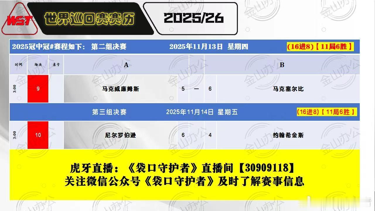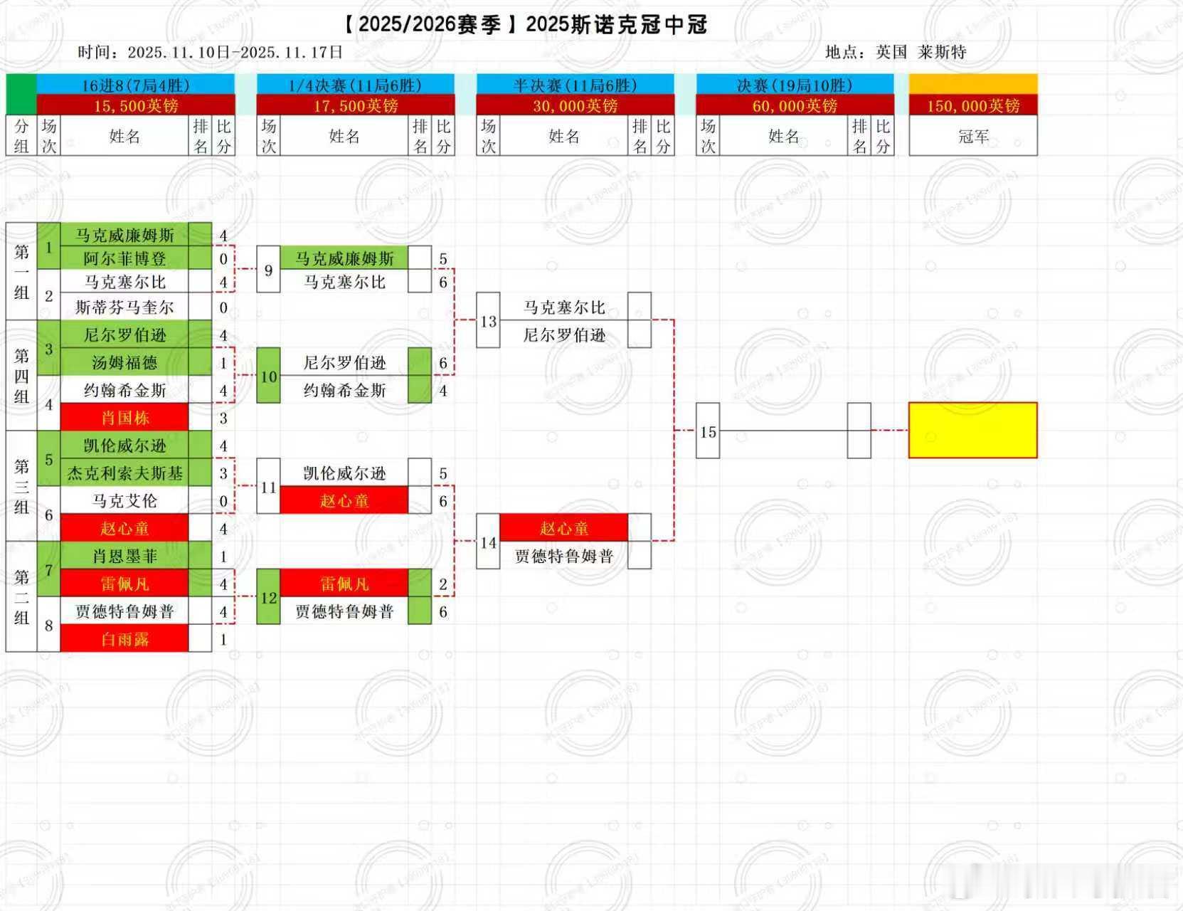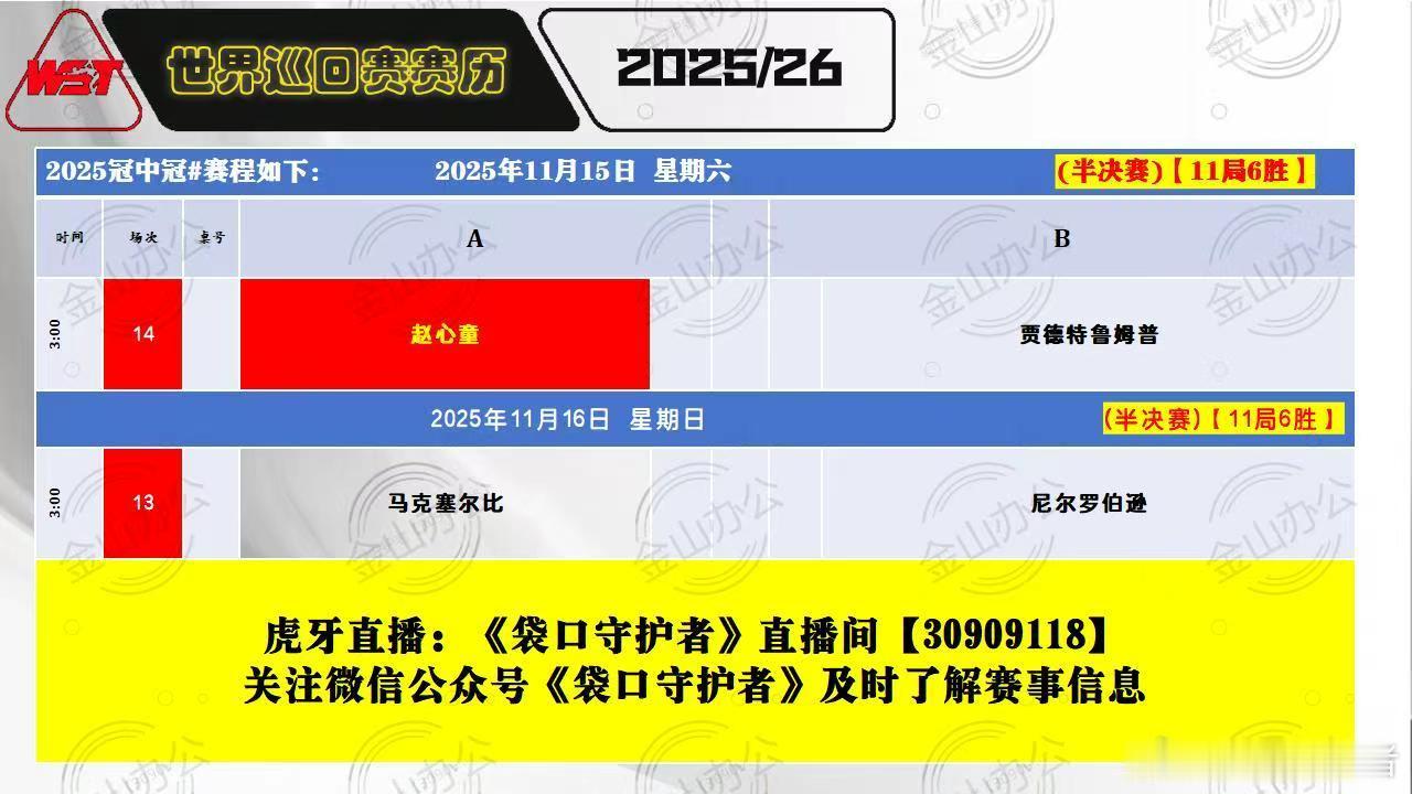 2025冠中冠半决赛(11局6胜)2025.11.14日 星期五明日凌晨3:00直播:赵心童VS贾德特鲁姆普