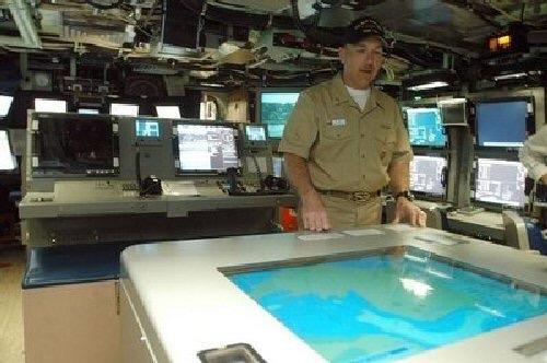 电子海图VS纸质海图和铅笔追踪位置、过程。(图一)俄亥俄级潜艇控制室绘图站(20世纪90年代)(图二)弗吉尼亚级潜艇控制室数字海图表。