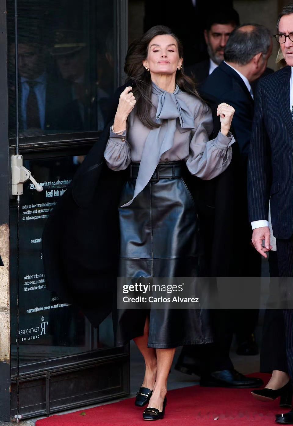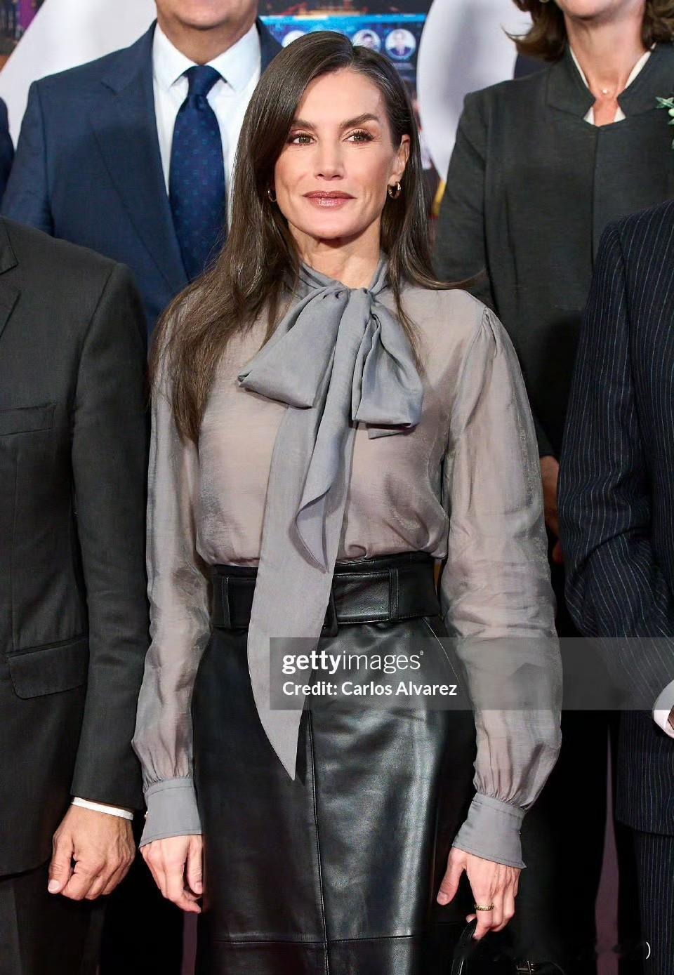 莱蒂齐亚王后出席CEOE基金会成立40周年庆祝活动,灰色系蝴蝶结薄纱衬衫搭配皮质黑色半裙,意气风发!