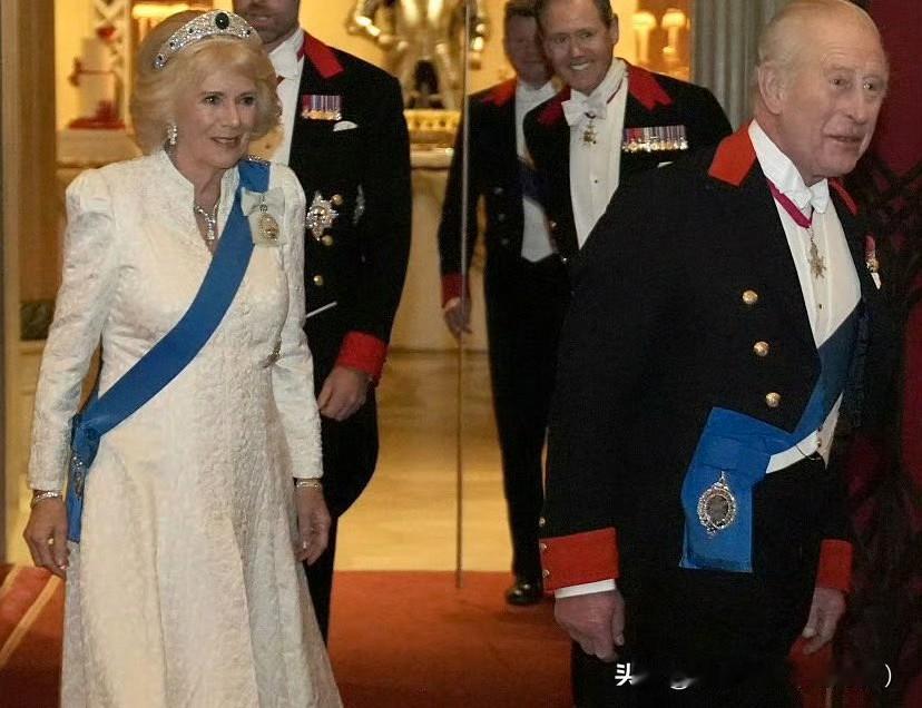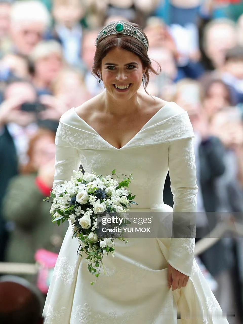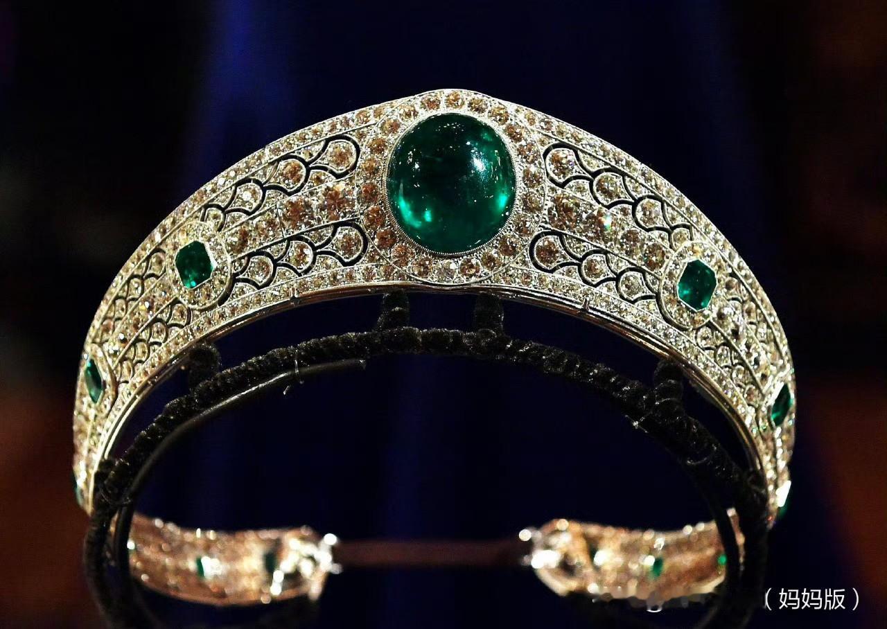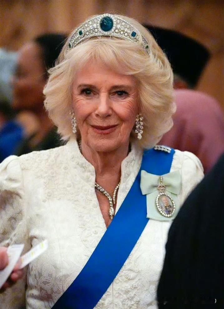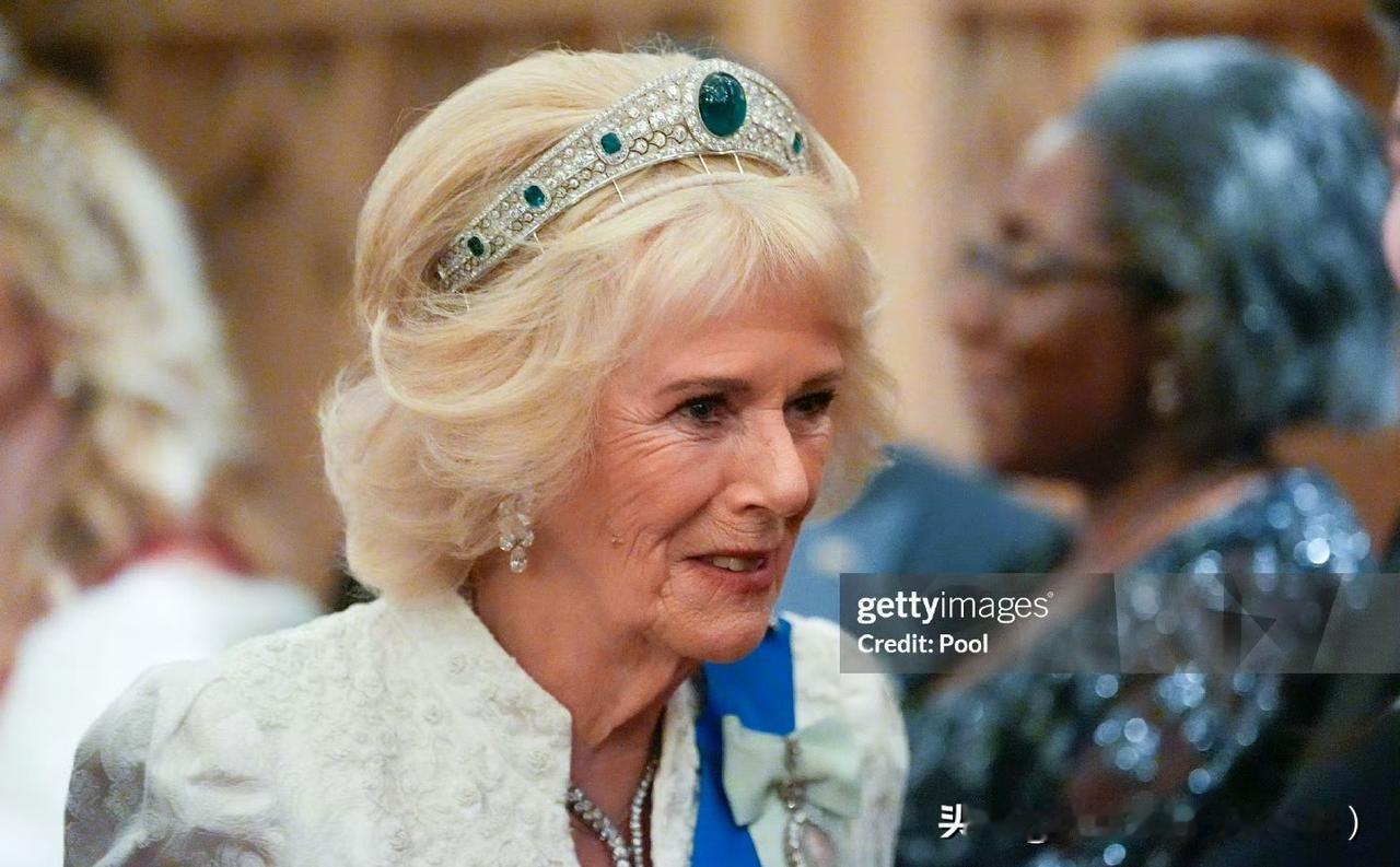 卡米拉王后在外交招待会上第一次佩戴了这顶格雷维尔祖母绿王冠!但是看着怪怪的,还是尤金妮公主2018年婚礼上的造型更出彩!