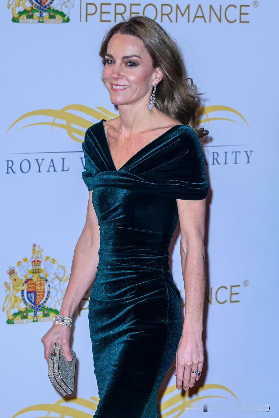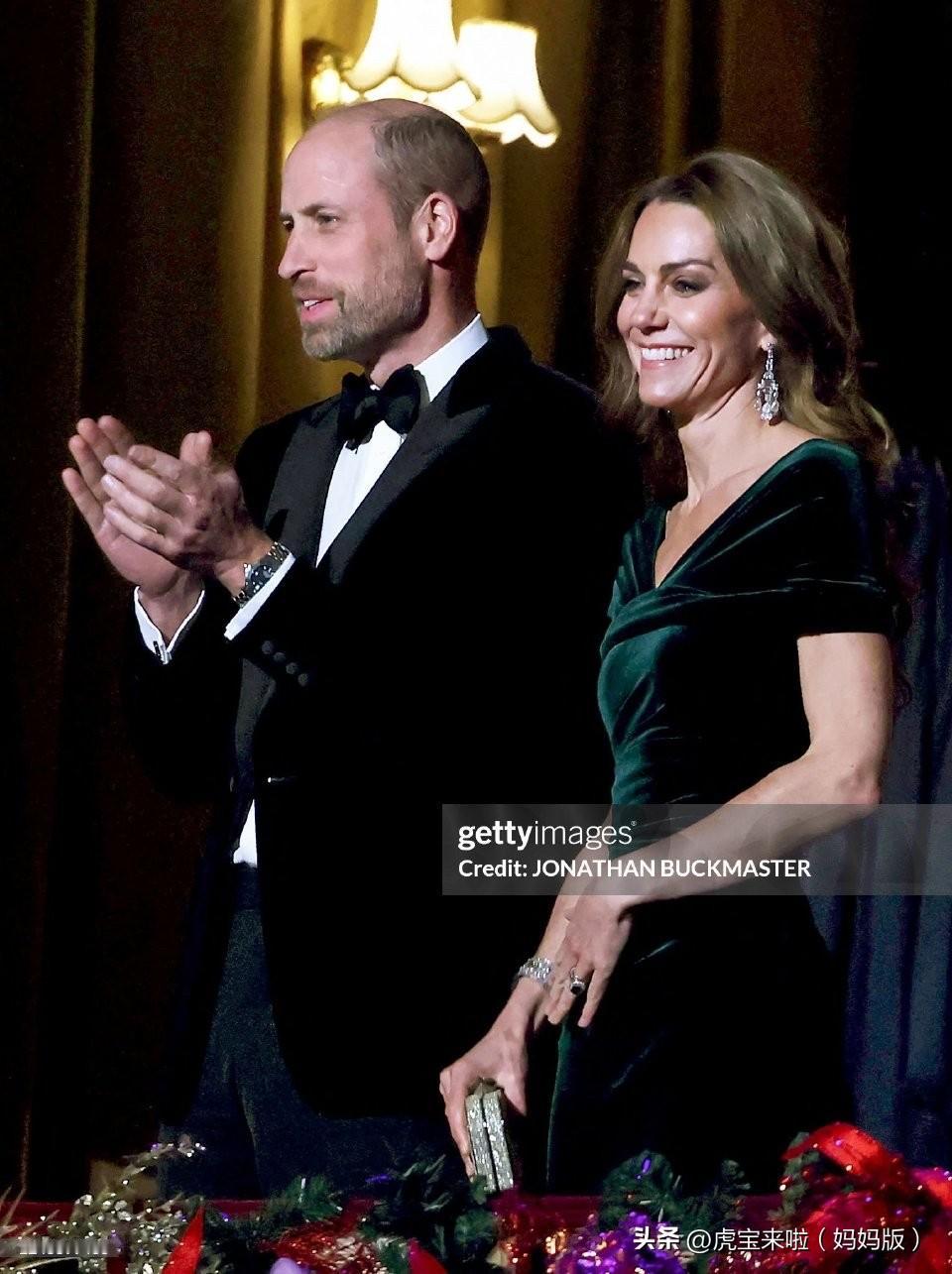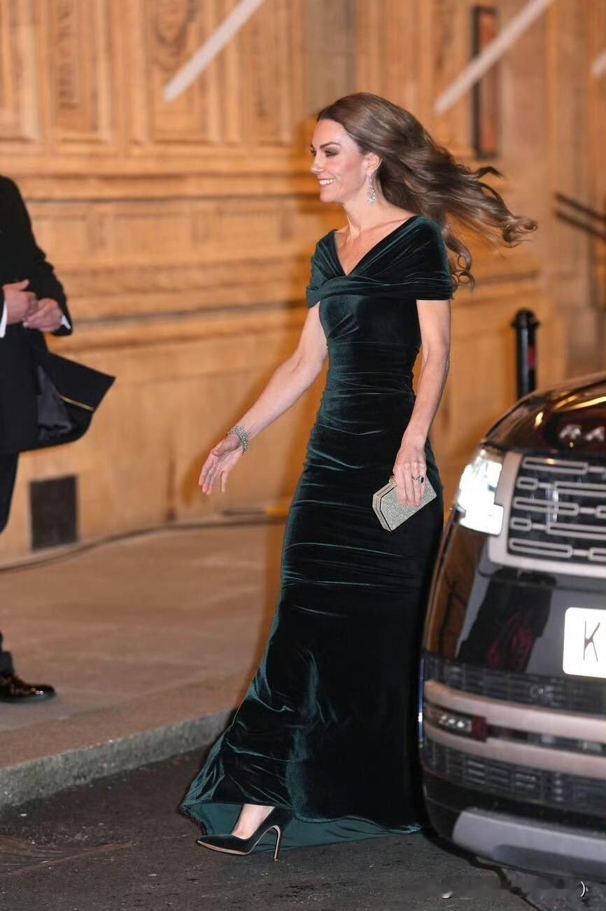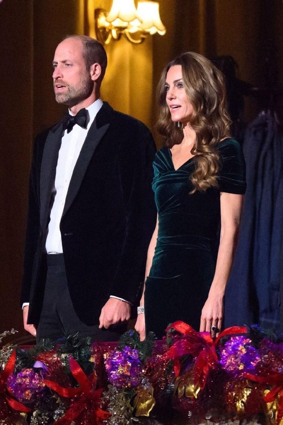威廉凯特合体活动,在皇家阿尔伯特音乐厅出席慈善文艺汇演。凯特王妃绿色丝绸礼服看着优雅,实际上夜间的气温并不高,实在是美丽冻人了!不过大波浪和露背设计都很和谐!