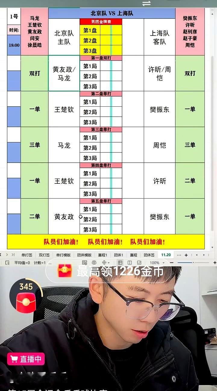 全运会男团决赛的排兵布阵出来了。 第一场双打马龙搭档黄友政对上许昕和周恺,胜负五五开,纯纯硬碰硬!第二场樊振东碰王楚钦,同样五五开,俩状态在线真能打。第三场马龙单挑周恺,龙队实力藏不住稳赢。第四场王楚钦打许昕,小王胜算更大。第五场黄友政对樊振东,小胖稳拿一分。 上海队想赢?得看樊振东能不能啃下王楚钦,然后第一局双打就是胜负手!北京队这排兵太鸡贼,把悬念全塞关键场,绝了!